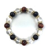 こちらは、レッドタイガーアイと水晶とオニキスを組み合わせたブレスレットです。間にはロンデルを挟み高級感あるデザインに仕上がっています。石大きさは腕にも馴染みやすいように10mm玉で内周約16cmです。数に限りがございますので気になる方はお早めにどうぞ。