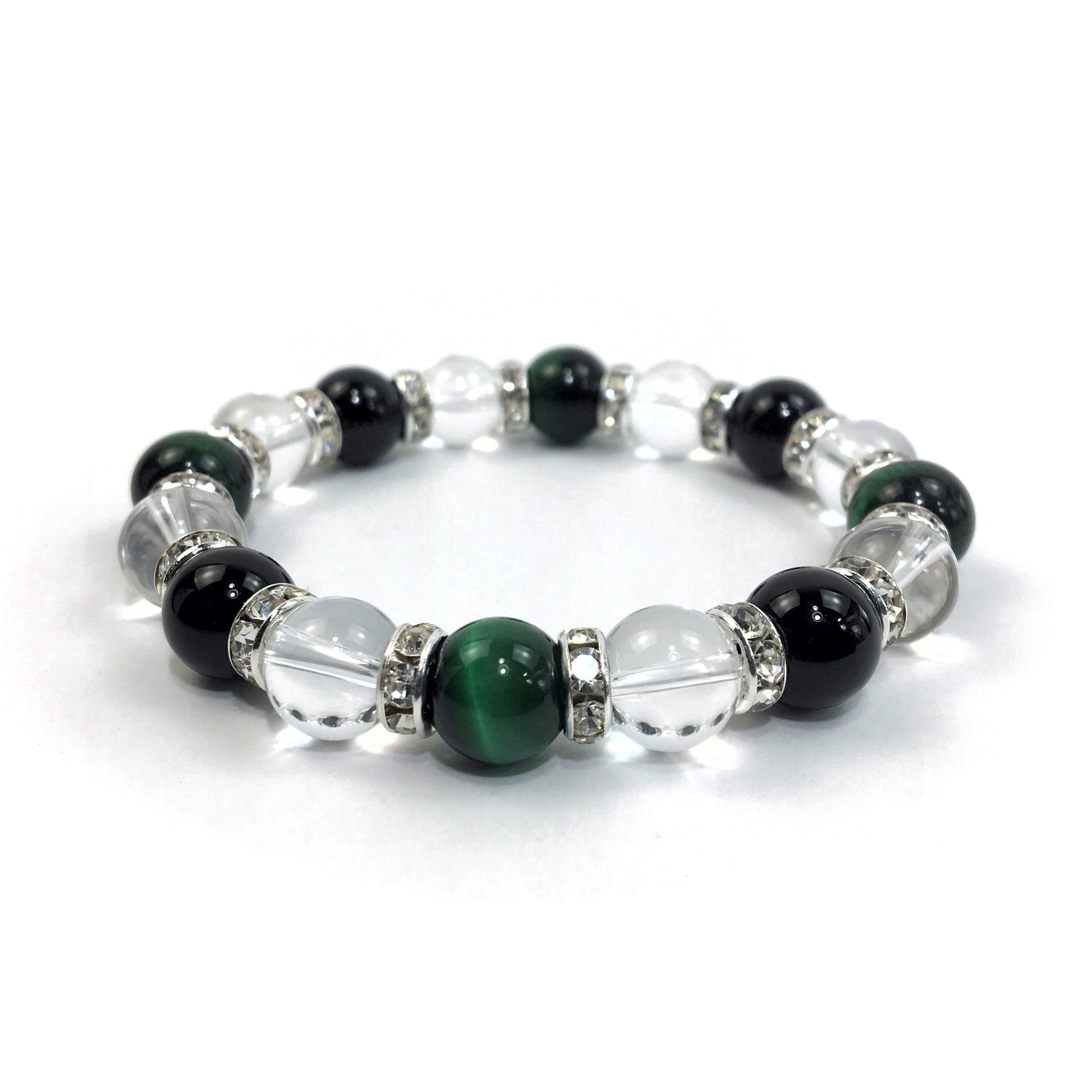 グリーンタイガーアイ×水晶×オニキス パワーストーン ブレスレット 10mm(シルバー)メンズ・レディース 男性・女性 数珠ブレス 開運 ☆