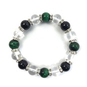こちらは、グリーンタイガーアイと水晶とオニキスを組み合わせたブレスレットです。間にはロンデルを挟み高級感あるデザインに仕上がっています。石大きさは腕にも馴染みやすいように10mm玉で内周約16cmです。数に限りがございますので気になる方はお早めにどうぞ。