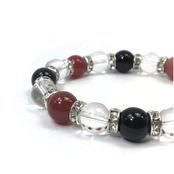 こちらは、赤瑪瑙と水晶とオニキスを組み合わせたブレスレットです。間にはロンデルを挟み高級感あるデザインに仕上がっています。石大きさは腕にも馴染みやすいように10mm玉で内周約16cmです。数に限りがございますので気になる方はお早めにどうぞ。