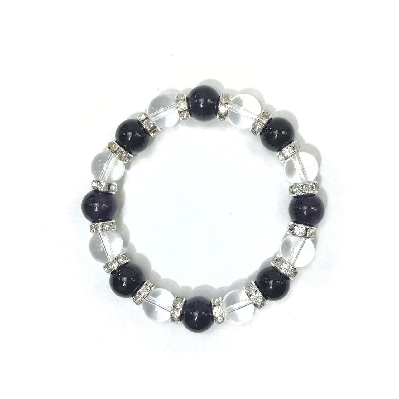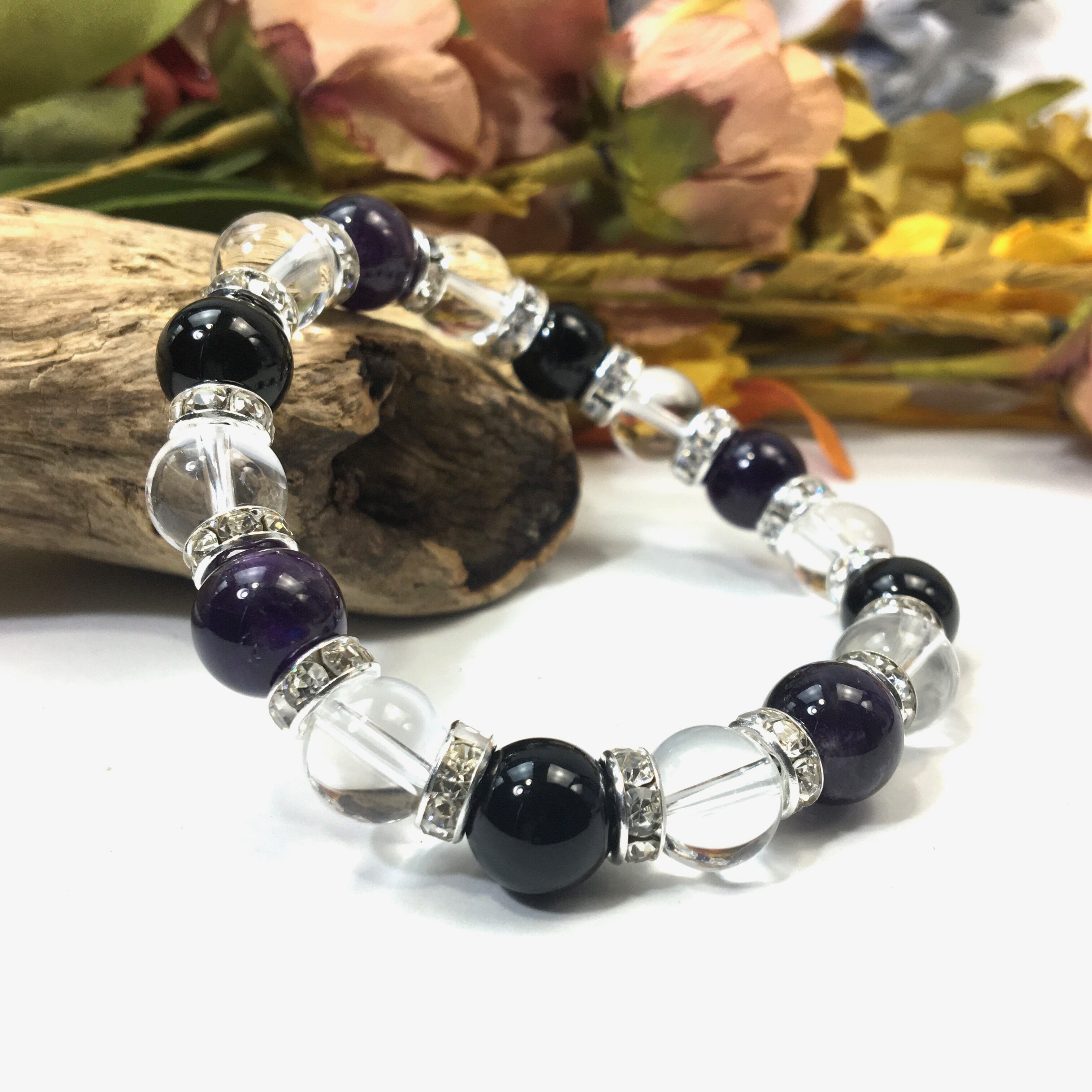 こちらは、アメジストと水晶とオニキスを組み合わせたブレスレットです。間にはロンデルを挟み高級感あるデザインに仕上がっています。石大きさは腕にも馴染みやすいように10mm玉で内周約16cmです。数に限りがございますので気になる方はお早めにどうぞ。