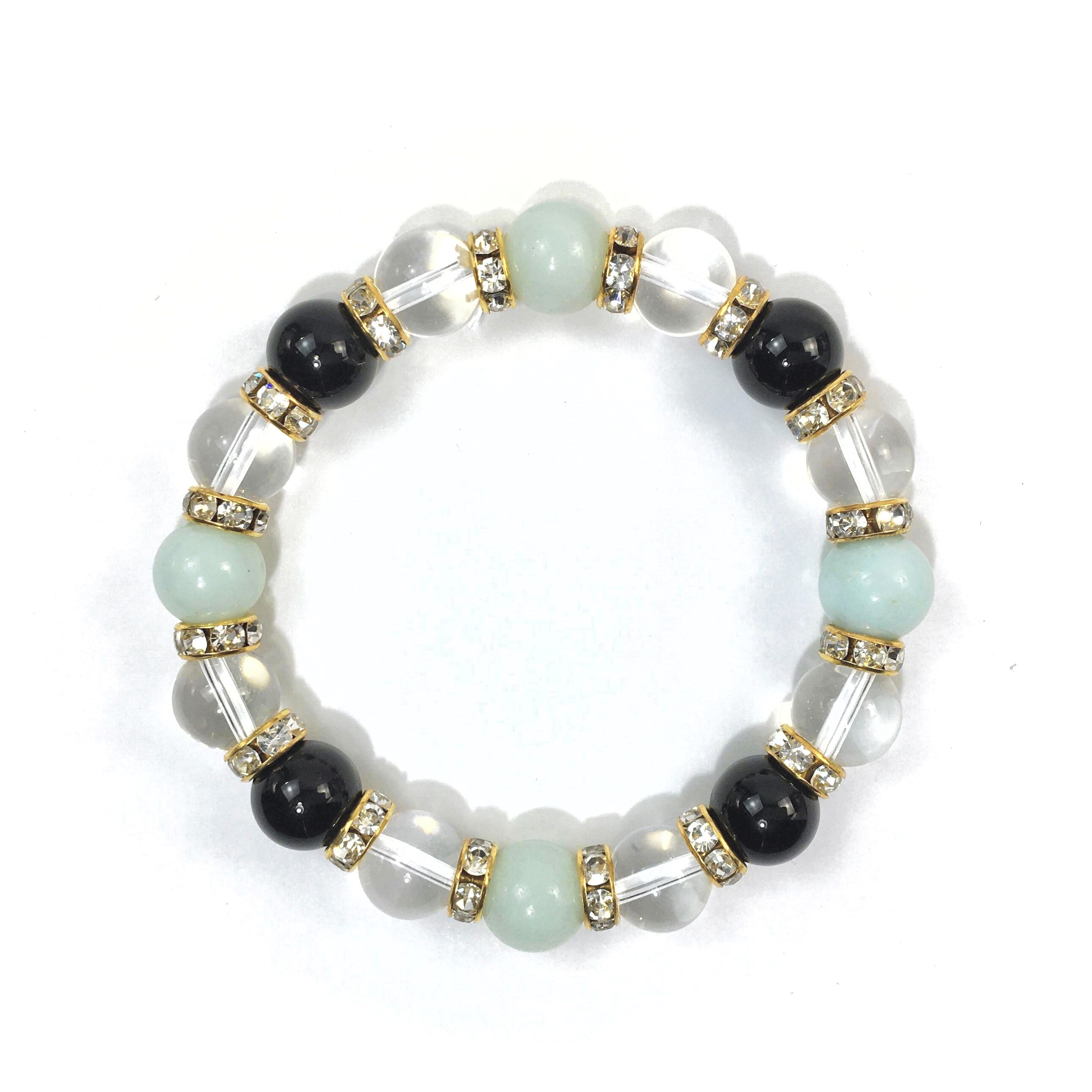 こちらは、アマゾナイトと水晶とオニキスを組み合わせたブレスレットです。間にはロンデルを挟み高級感あるデザインに仕上がっています。石大きさは腕にも馴染みやすいように10mm玉で内周約16cmです。数に限りがございますので気になる方はお早めにどうぞ。