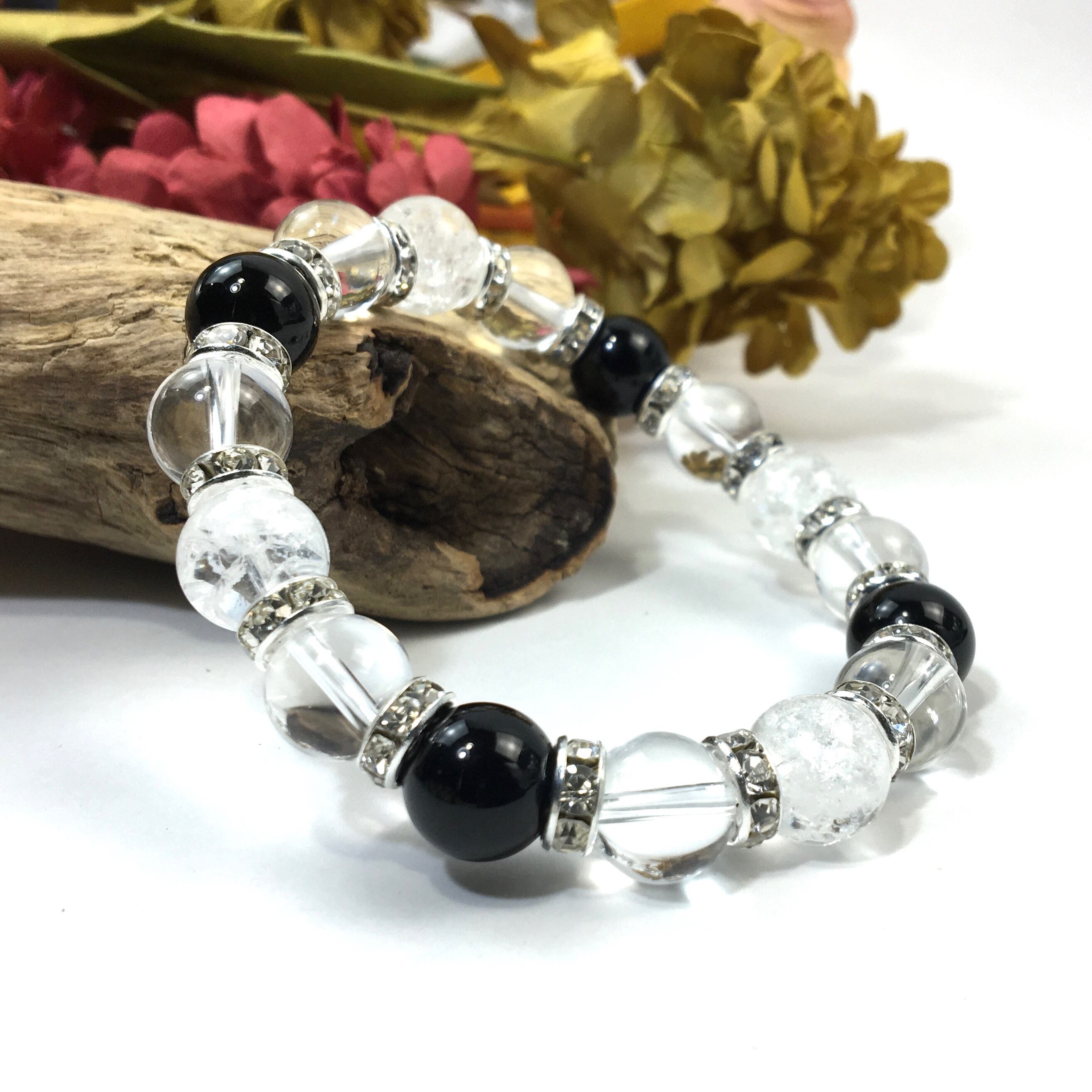 こちらは、クラック水晶と水晶とオニキスを組み合わせたブレスレットです。間にはロンデルを挟み高級感あるデザインに仕上がっています。石大きさは腕にも馴染みやすいように10mm玉で内周約16cmです。数に限りがございますので気になる方はお早めにどうぞ。