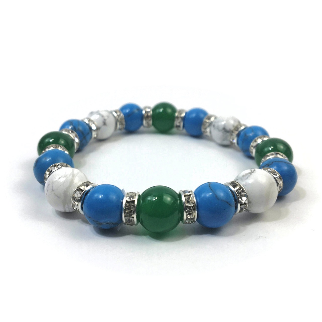こちらは、緑瑪瑙とハウライトとターコイズを組み合わせたブレスレットです。間にはロンデルを挟み高級感あるデザインに仕上がっています。石大きさは腕にも馴染みやすいように10mm玉で内周約16cmです。数に限りがございますので気になる方はお早めにどうぞ。