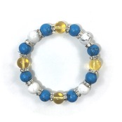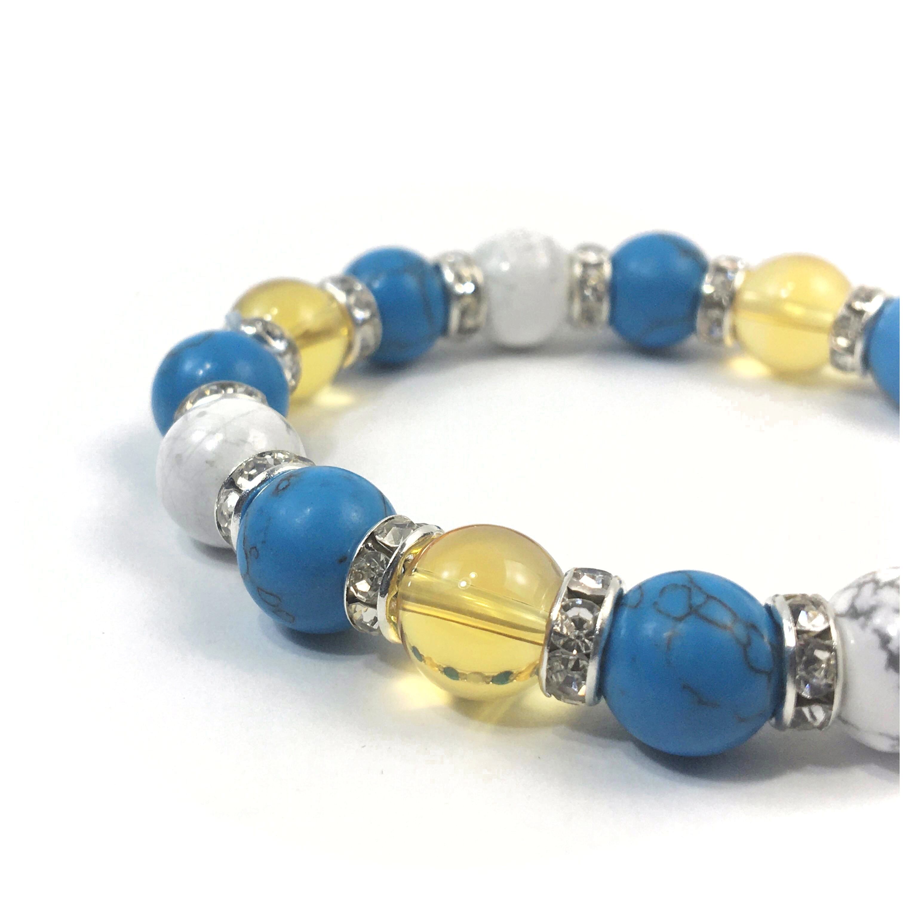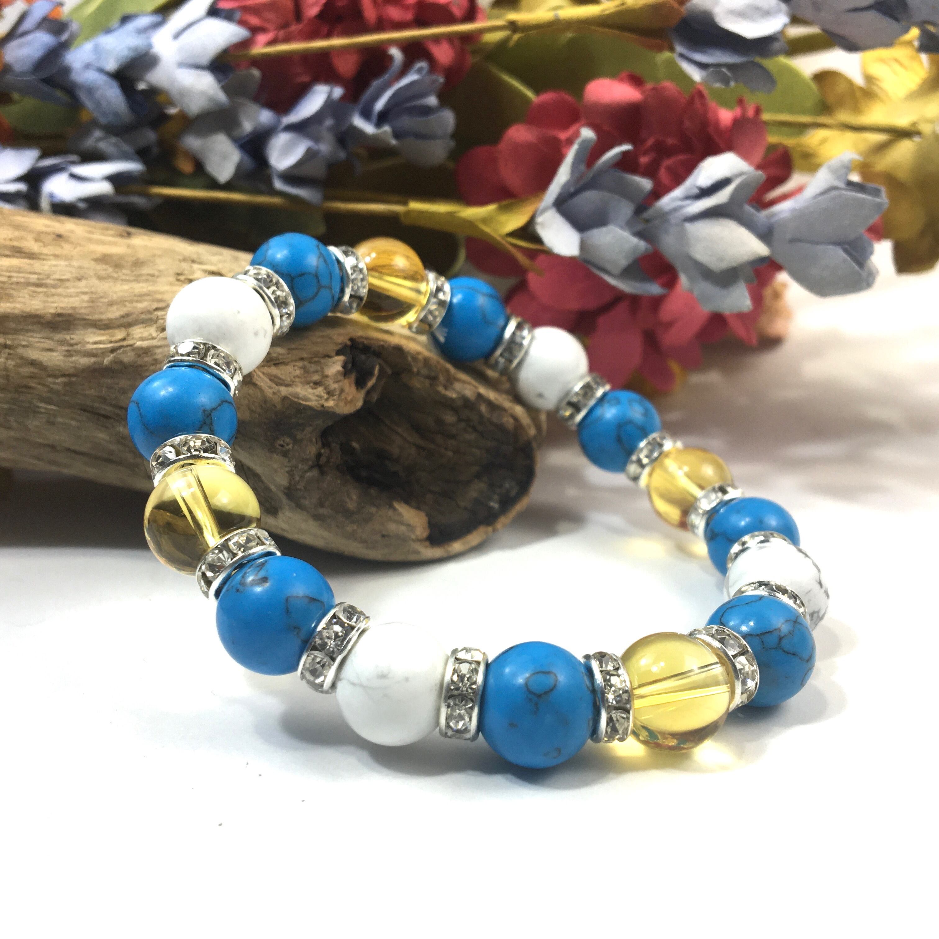 こちらは、シトリンとハウライトとターコイズを組み合わせたブレスレットです。間にはロンデルを挟み高級感あるデザインに仕上がっています。石大きさは腕にも馴染みやすいように10mm玉で内周約16cmです。数に限りがございますので気になる方はお早めにどうぞ。