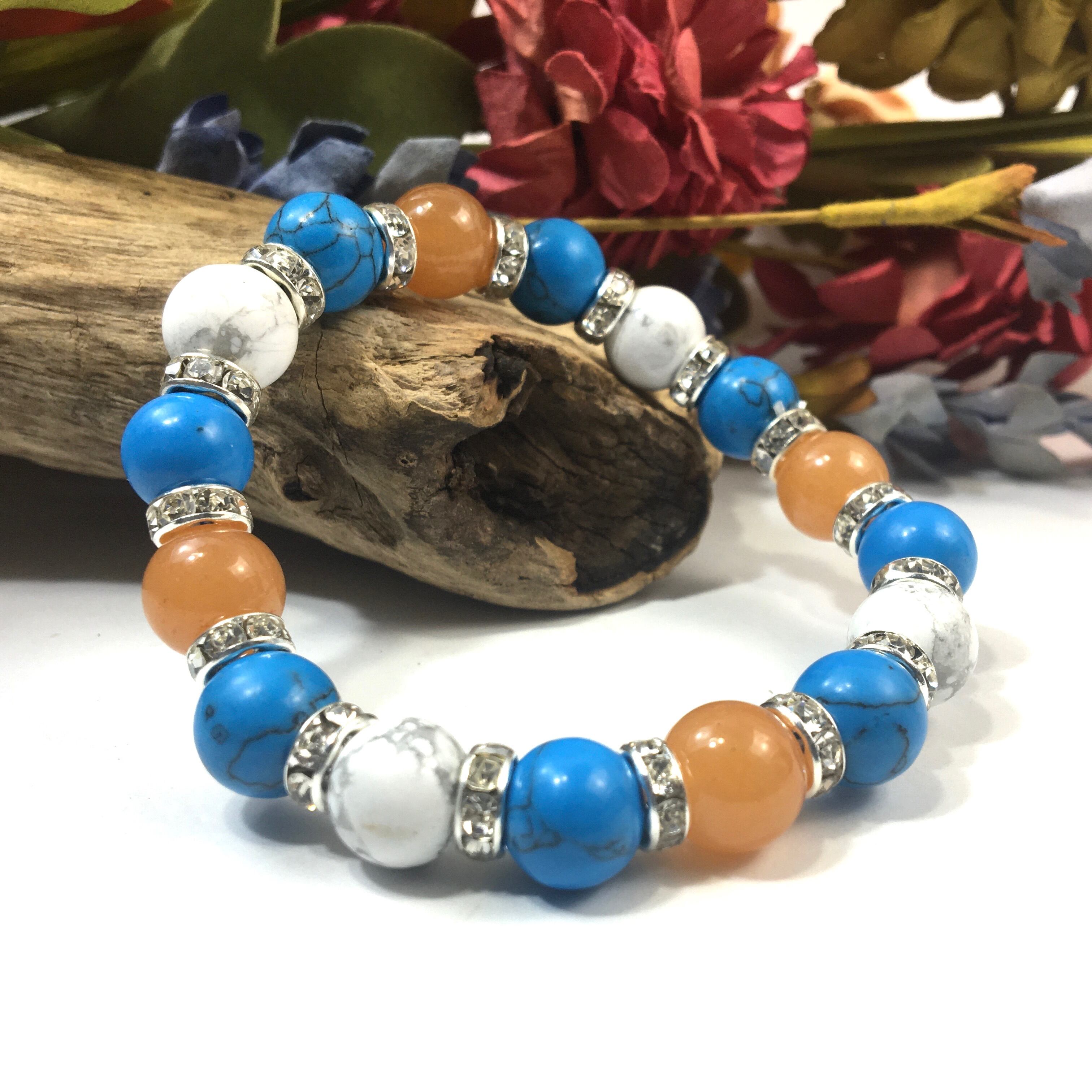 こちらは、レッドアベンチュリンとハウライトとターコイズを組み合わせたブレスレットです。間にはロンデルを挟み高級感あるデザインに仕上がっています。石大きさは腕にも馴染みやすいように10mm玉で内周約16cmです。数に限りがございますので気になる方はお早めにどうぞ。