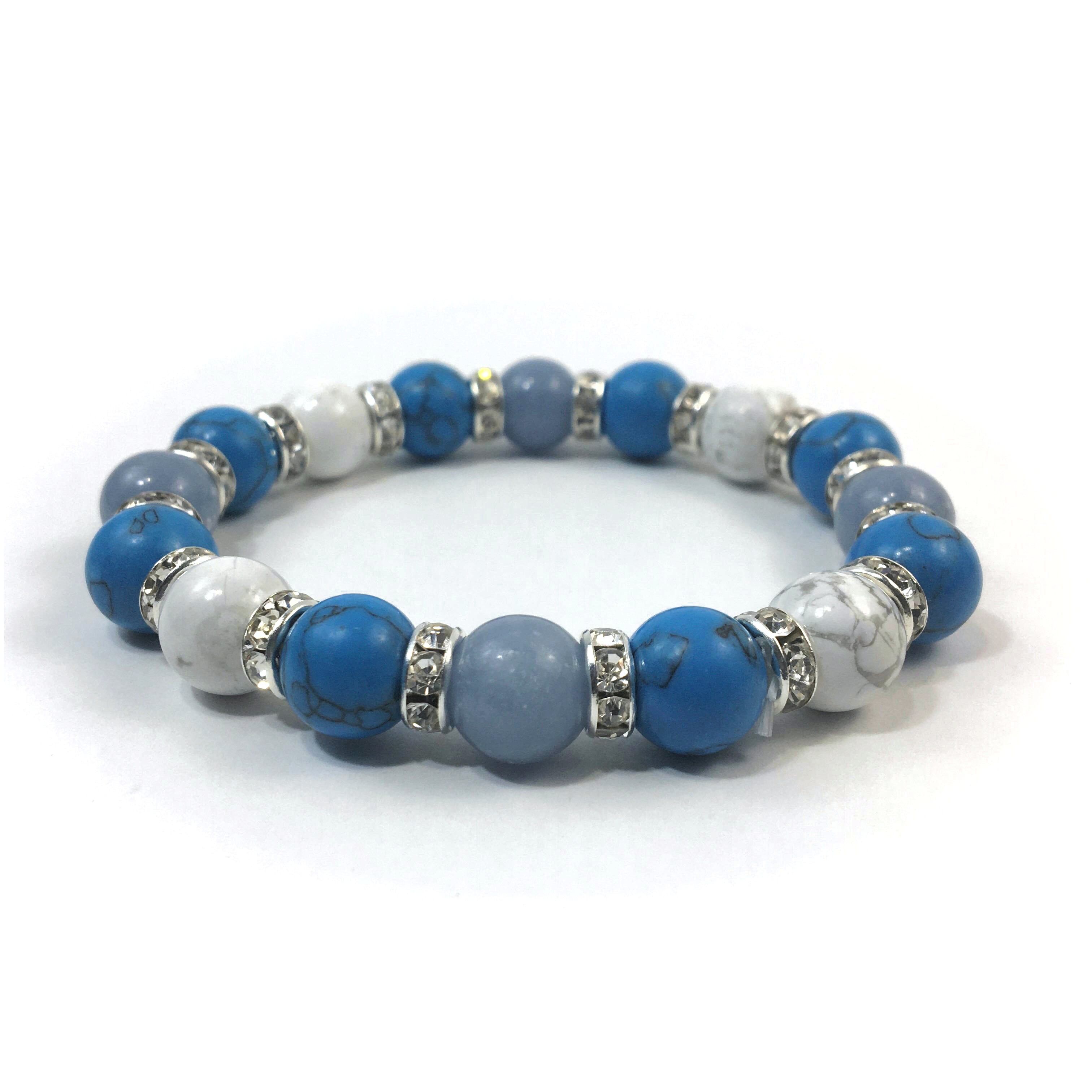 こちらは、エンジェライトとハウライトとターコイズを組み合わせたブレスレットです。間にはロンデルを挟み高級感あるデザインに仕上がっています。石大きさは腕にも馴染みやすいように10mm玉で内周約16cmです。数に限りがございますので気になる方はお早めにどうぞ。