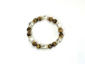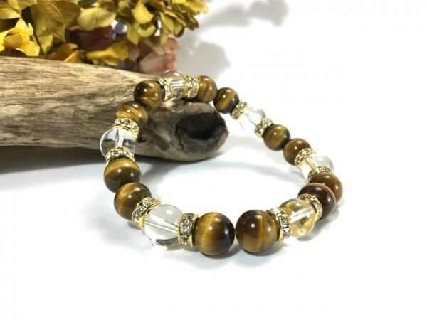 こちらは、タイガーアイと水晶を組み合わせたブレスレットです。間にはロンデルを挟み高級感あるデザインに仕上がっています。石大きさは腕にも馴染みやすいように10mm玉で内周約17cm(伸可能)です。数に限りがございますので気になる方はお早めにどうぞ。