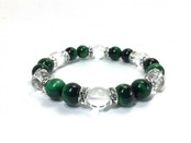 こちらは、グリーンタイガーアイと水晶を組み合わせたブレスレットです。間にはロンデルを挟み高級感あるデザインに仕上がっています。石大きさは腕にも馴染みやすいように10mm玉で内周約17cm(伸可能)です。数に限りがございますので気になる方はお早めにどうぞ。