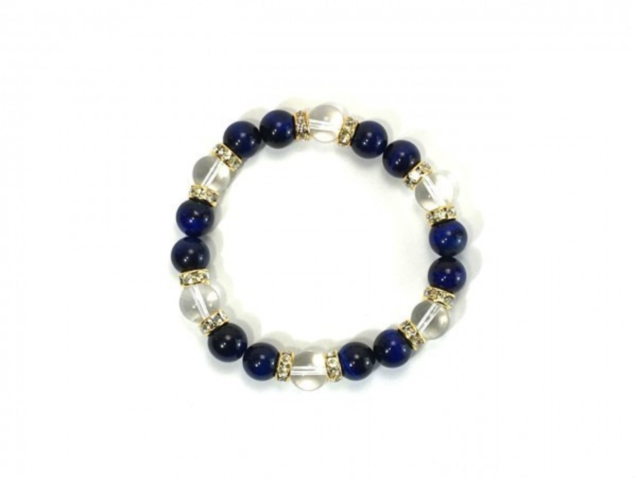 こちらは、ブルータイガーアイと水晶を組み合わせたブレスレットです。間にはロンデルを挟み高級感あるデザインに仕上がっています。石大きさは腕にも馴染みやすいように10mm玉で内周約17cm(伸可能)です。数に限りがございますので気になる方はお早めにどうぞ。