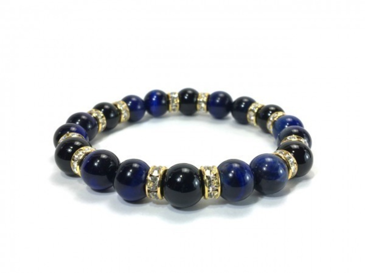 こちらは、ブルータイガーアイとオニキスを組み合わせたブレスレットです。間にはロンデルを挟み高級感あるデザインに仕上がっています。石大きさは腕にも馴染みやすいように10mm玉で内周約17cm(伸可能)です。数に限りがございますので気になる方はお早めにどうぞ。
