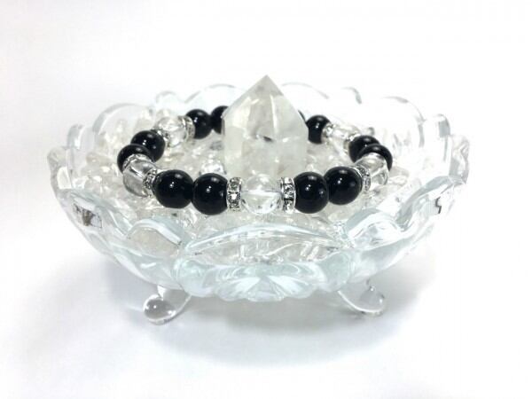 こちらは、オニキスと水晶を組み合わせたブレスレットです。間にはロンデルを挟み高級感あるデザインに仕上がっています。石大きさは腕にも馴染みやすいように10mm玉で内周約17cm(伸可能)です。数に限りがございますので気になる方はお早めにどうぞ。
