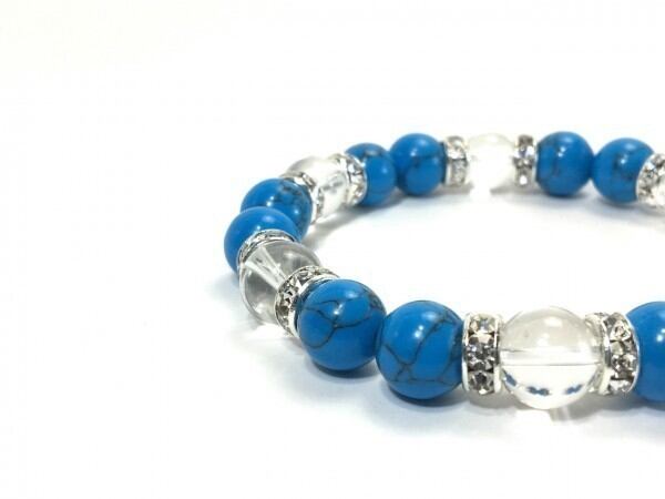 こちらは、ターコイズと水晶を組み合わせたブレスレットです。間にはロンデルを挟み高級感あるデザインに仕上がっています。石大きさは腕にも馴染みやすいように10mm玉で内周約17cm(伸可能)です。数に限りがございますので気になる方はお早めにどうぞ。