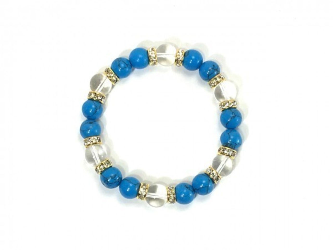 こちらは、ターコイズと水晶を組み合わせたブレスレットです。間にはロンデルを挟み高級感あるデザインに仕上がっています。石大きさは腕にも馴染みやすいように10mm玉で内周約17cm(伸可能)です。数に限りがございますので気になる方はお早めにどうぞ。