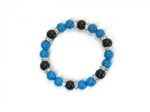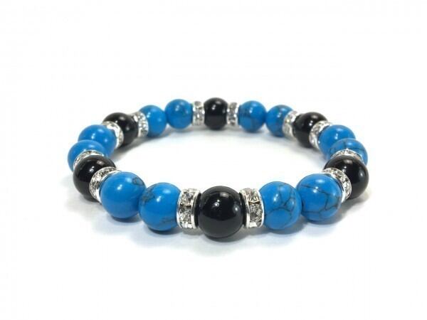 こちらは、ターコイズとオニキスを組み合わせたブレスレットです。間にはロンデルを挟み高級感あるデザインに仕上がっています。石大きさは腕にも馴染みやすいように10mm玉で内周約17cm(伸可能)です。数に限りがございますので気になる方はお早めにどうぞ。