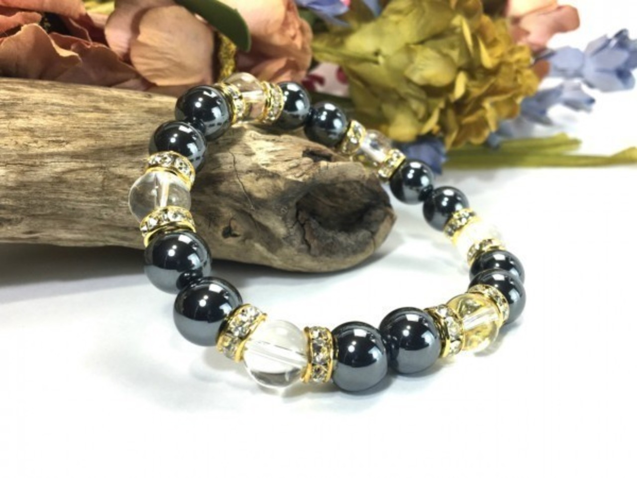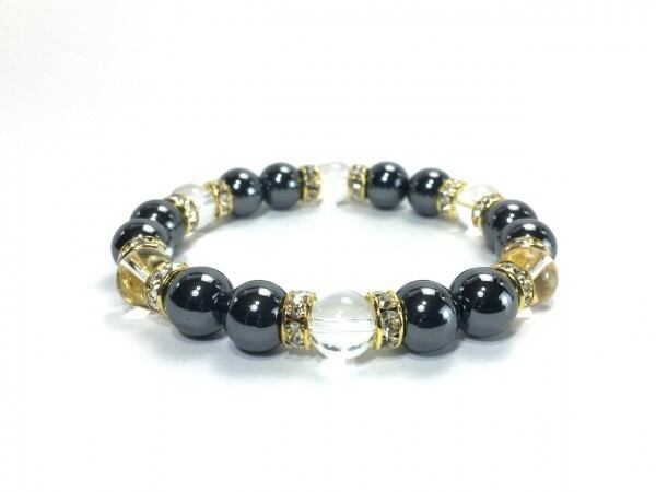 こちらは、ヘマタイトと水晶を組み合わせたブレスレットです。間にはロンデルを挟み高級感あるデザインに仕上がっています。石大きさは腕にも馴染みやすいように10mm玉で内周約17cm(伸可能)です。数に限りがございますので気になる方はお早めにどうぞ。