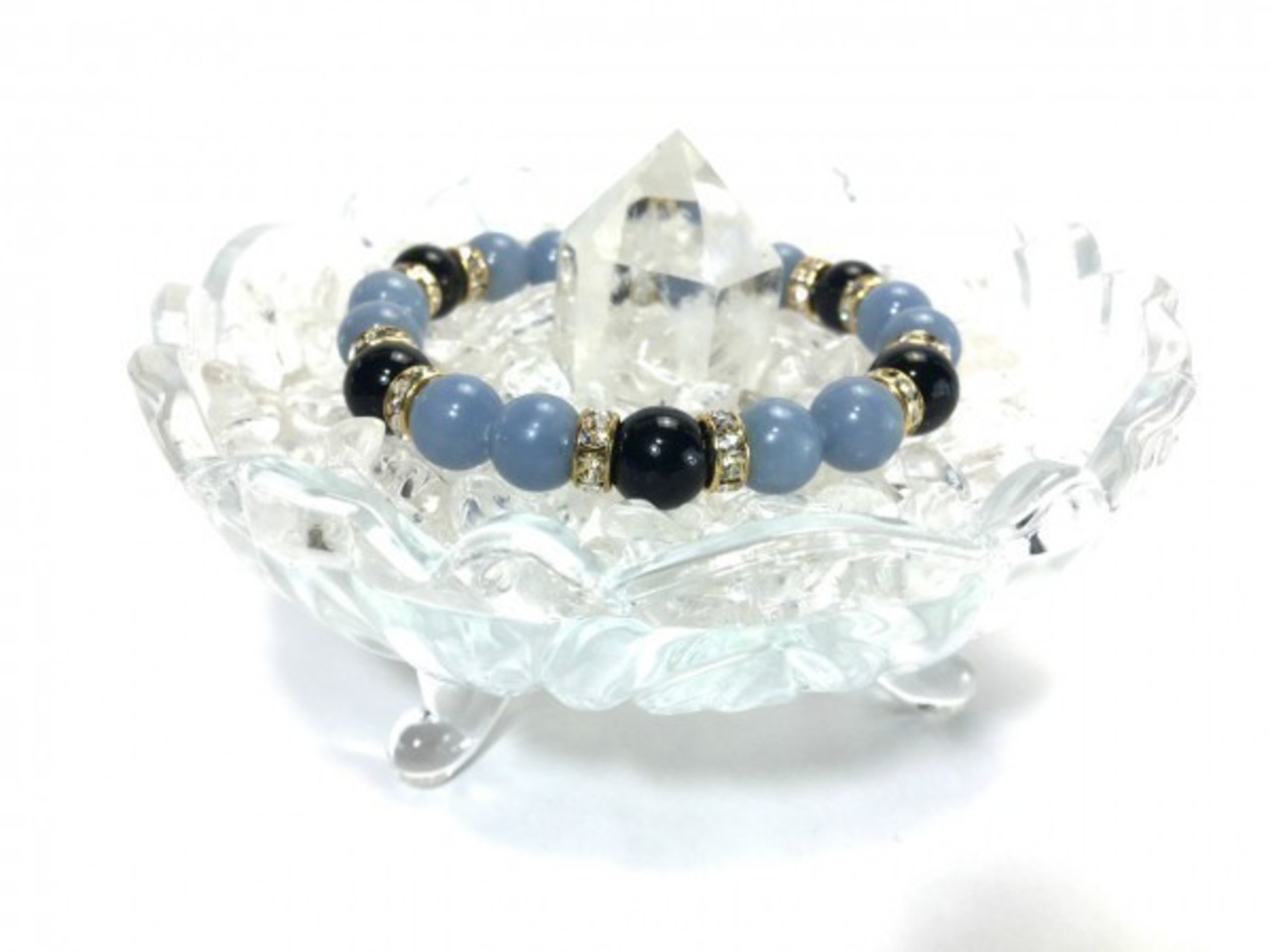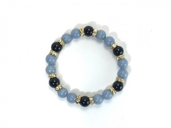 こちらは、エンジェライトとオニキスを組み合わせたブレスレットです。間にはロンデルを挟み高級感あるデザインに仕上がっています。石大きさは腕にも馴染みやすいように10mm玉で内周約17cm(伸可能)です。数に限りがございますので気になる方はお早めにどうぞ。
