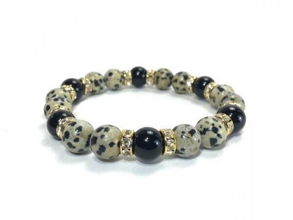 こちらは、ダルメシアンジャスパーとオニキスを組み合わせたブレスレットです。間にはロンデルを挟み高級感あるデザインに仕上がっています。石大きさは腕にも馴染みやすいように10mm玉で内周約17cm(伸可能)です。数に限りがございますので気になる方はお早めにどうぞ。