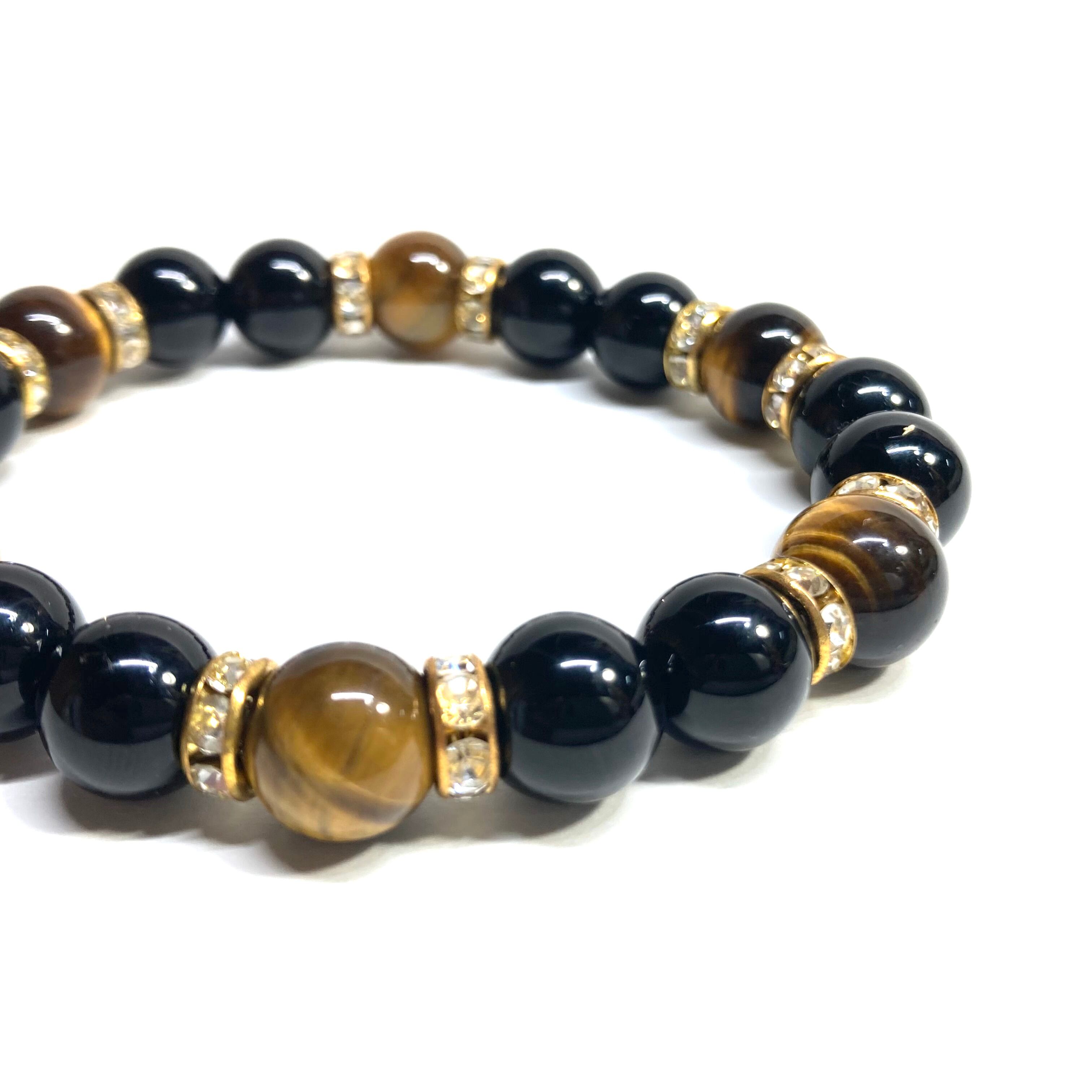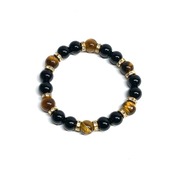 こちらは、モリオンとタイガーアイを組み合わせたパワーストーンブレスレットです。間にはロンデルを挟み高級感あるデザインに仕上げております。石大きさは腕にも馴染みやすいように10mm玉で内周 約18cm(伸可能)です。 数に限りがございますので気になる方はお早めにどうぞ。