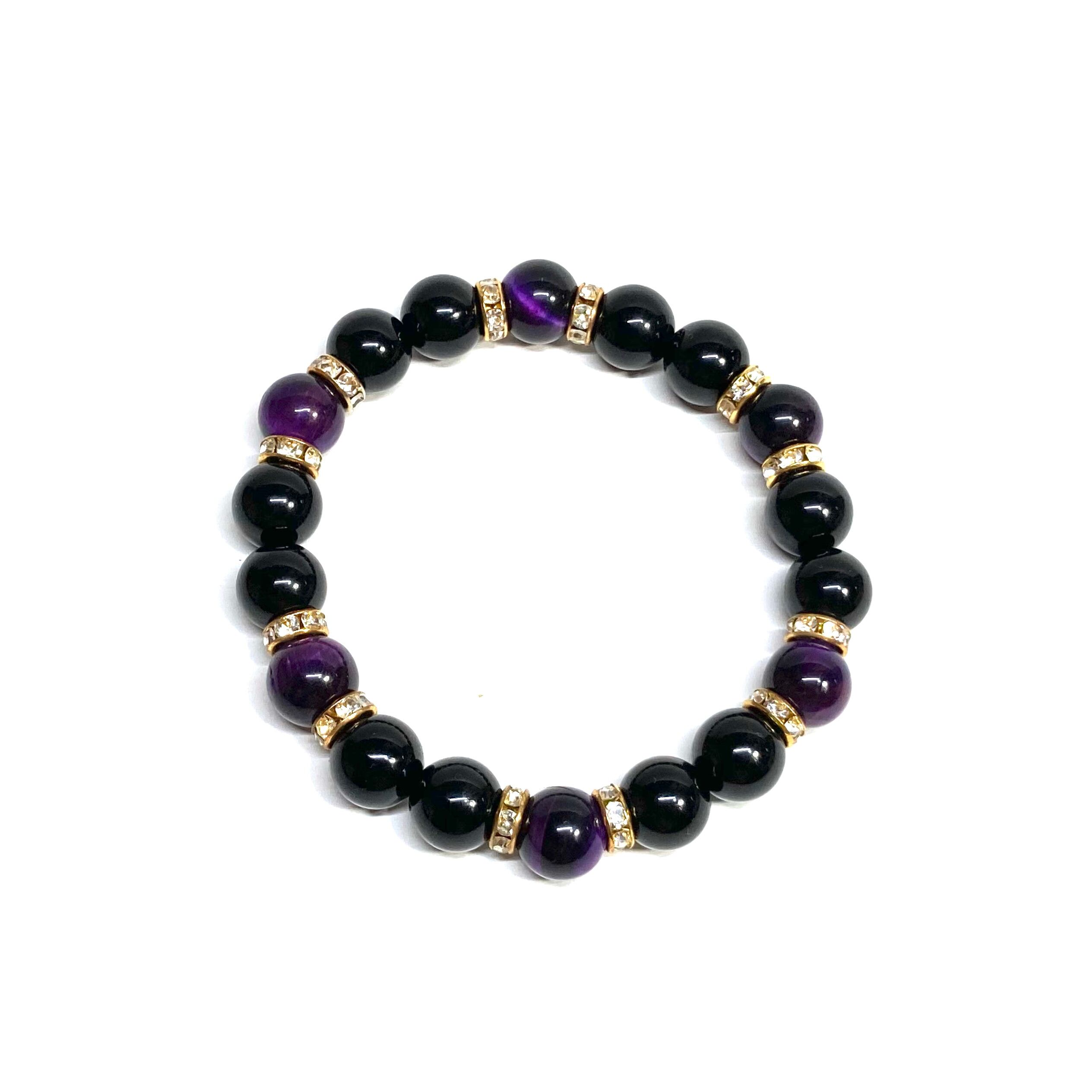 こちらは、モリオンとパープル タイガーアイを組み合わせたパワーストーンブレスレットです。間にはロンデルを挟み高級感あるデザインに仕上げております。石大きさは腕にも馴染みやすいように10mm玉で内径約18cm(伸可能)です。 数に限りがございますので気になる方はお早めにどうぞ。