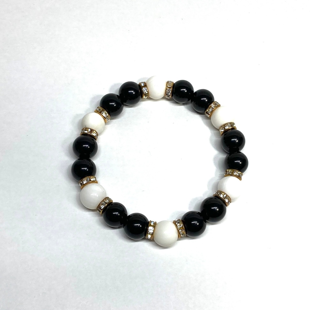 こちらは、モリオンとホワイトオニキスを組み合わせたパワーストーンブレスレットです。間にはロンデルを挟み高級感あるデザインに仕上げております。石大きさは腕にも馴染みやすいように10mm玉で内径約18cm(伸可能)です。 数に限りがございますので気になる方はお早めにどうぞ。