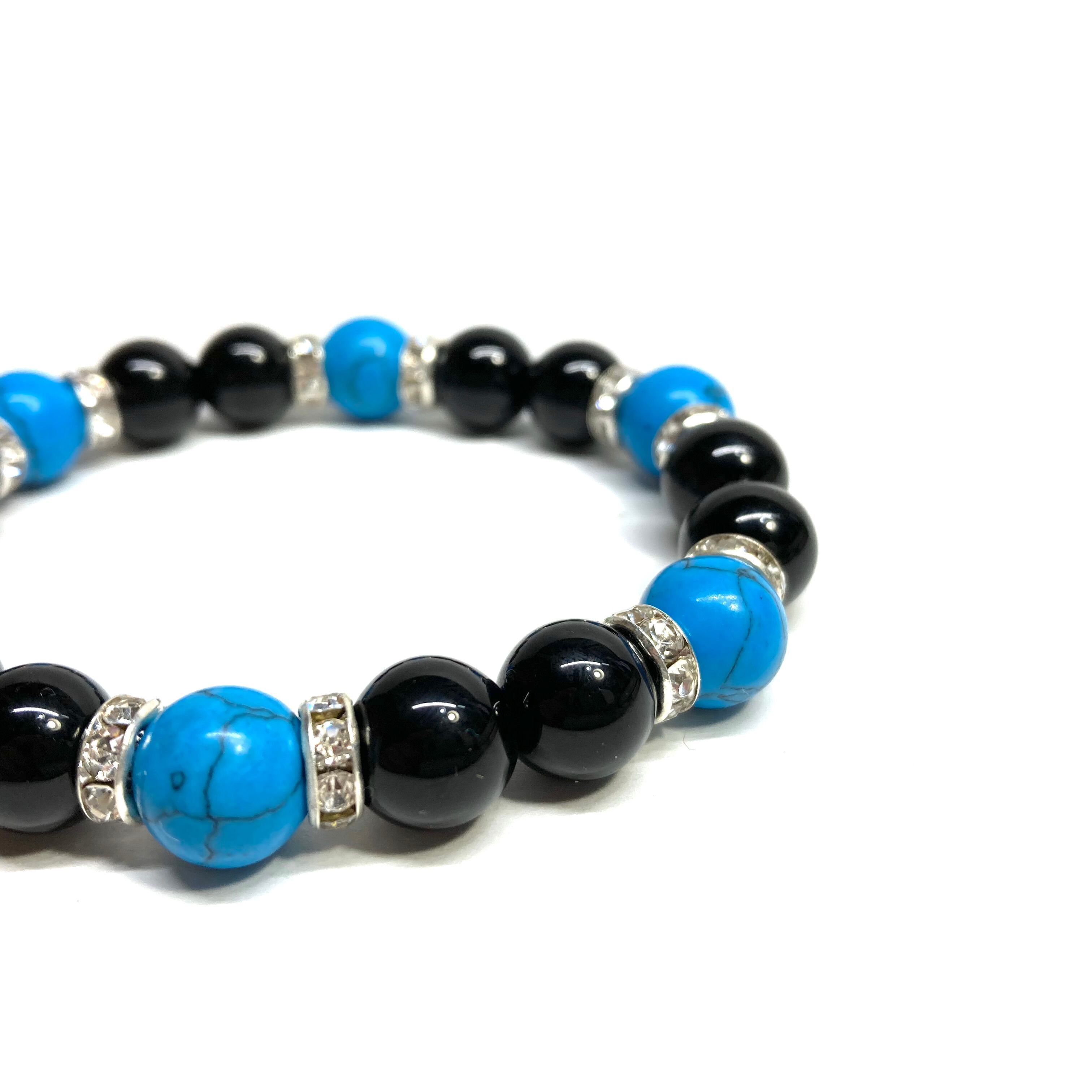 こちらは、モリオンとターコイズを組み合わせたパワーストーンブレスレットです。間にはロンデルを挟み高級感あるデザインに仕上げております。石大きさは腕にも馴染みやすいように10mm玉で内径約18cm(伸可能)です。 数に限りがございますので気になる方はお早めにどうぞ。