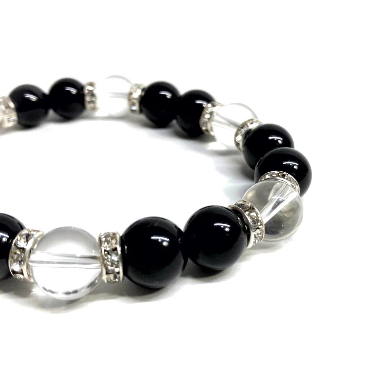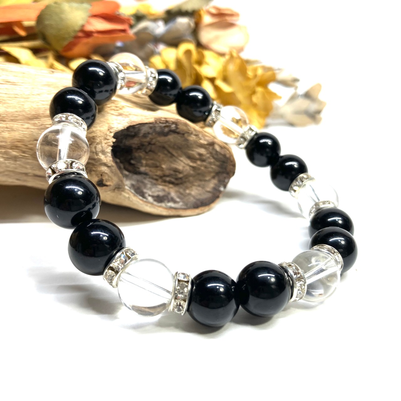 こちらは、モリオンと水晶を組み合わせたパワーストーンブレスレットです。間にはロンデルを挟み高級感あるデザインに仕上げております。石大きさは腕にも馴染みやすいように10mm玉で内径約18cm(伸可能)です。 数に限りがございますので気になる方はお早めにどうぞ。