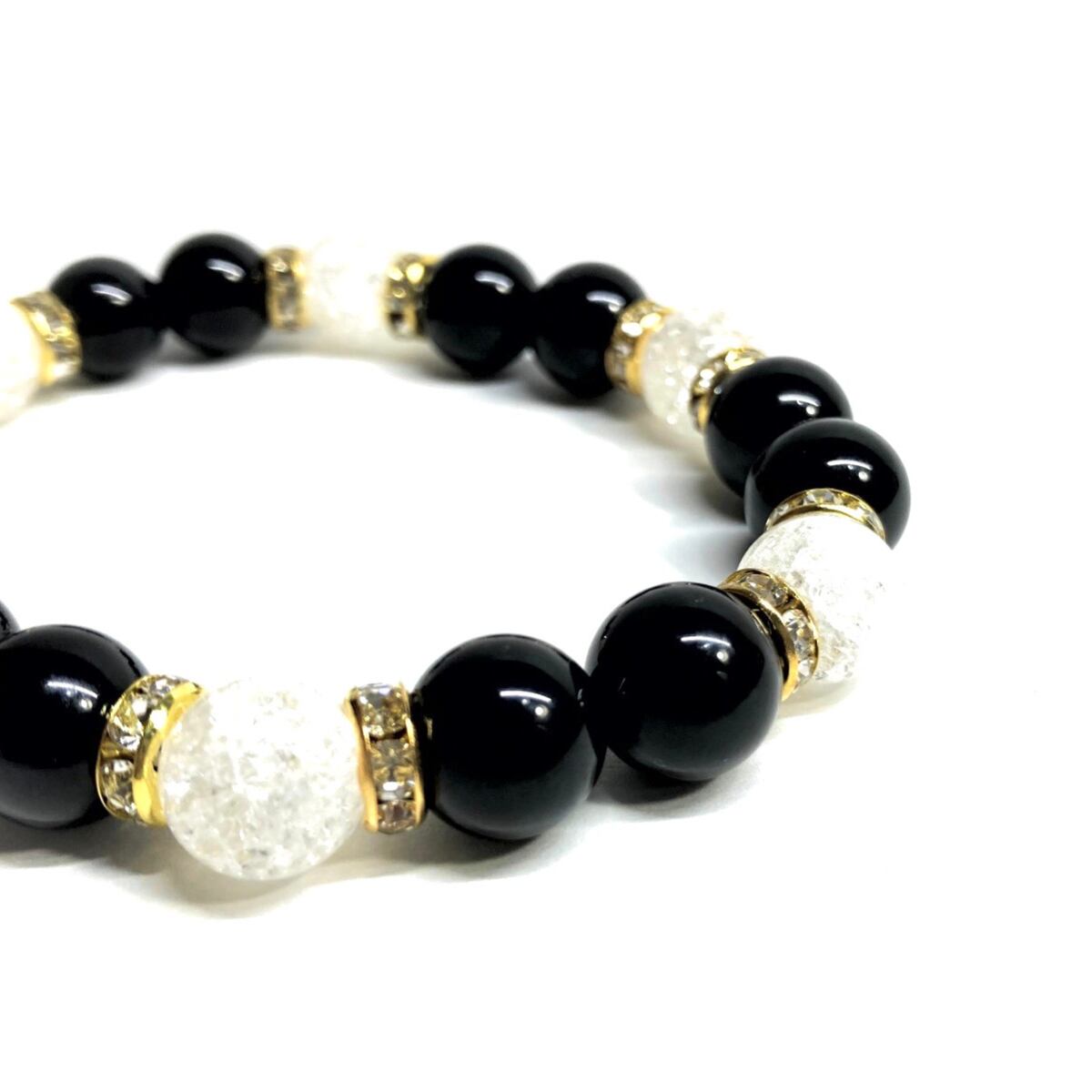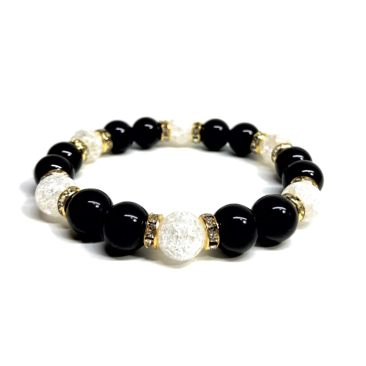 こちらは、モリオンとクラック水晶を組み合わせたパワーストーンブレスレットです。間にはロンデルを挟み高級感あるデザインに仕上げております。石大きさは腕にも馴染みやすいように10mm玉で内径約18cm(伸可能)です。 数に限りがございますので気になる方はお早めにどうぞ。