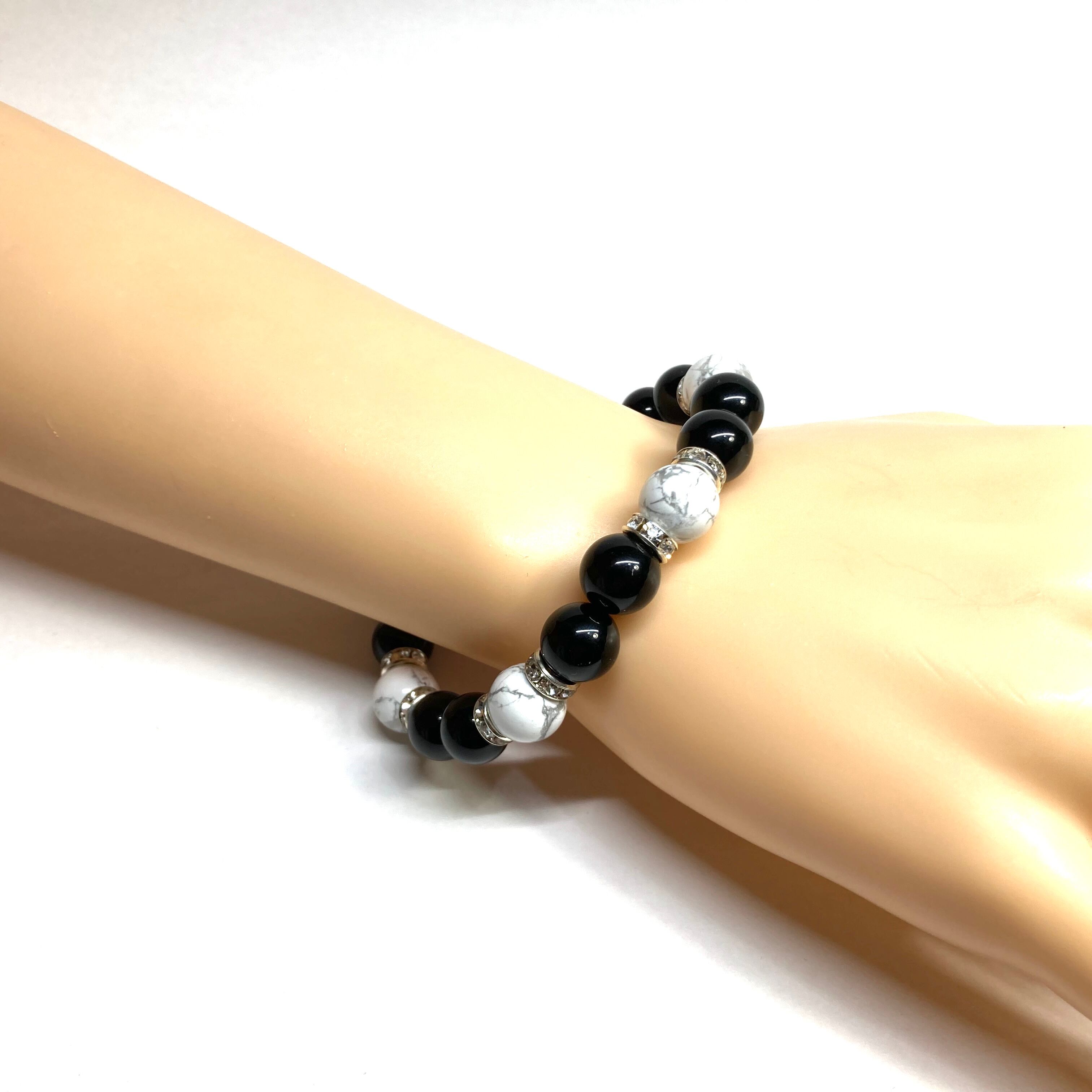 こちらは、モリオンとハウライトを組み合わせたパワーストーンブレスレットです。間にはロンデルを挟み高級感あるデザインに仕上げております。石大きさは腕にも馴染みやすいように10mm玉で内径約18cm(伸可能)です。 数に限りがございますので気になる方はお早めにどうぞ。