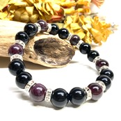 こちらは、モリオンとガーネットを組み合わせたパワーストーンブレスレットです。間にはロンデルを挟み高級感あるデザインに仕上げております。石大きさは腕にも馴染みやすいように10mm玉で内径約18cm(伸可能)です。 数に限りがございますので気になる方はお早めにどうぞ。
