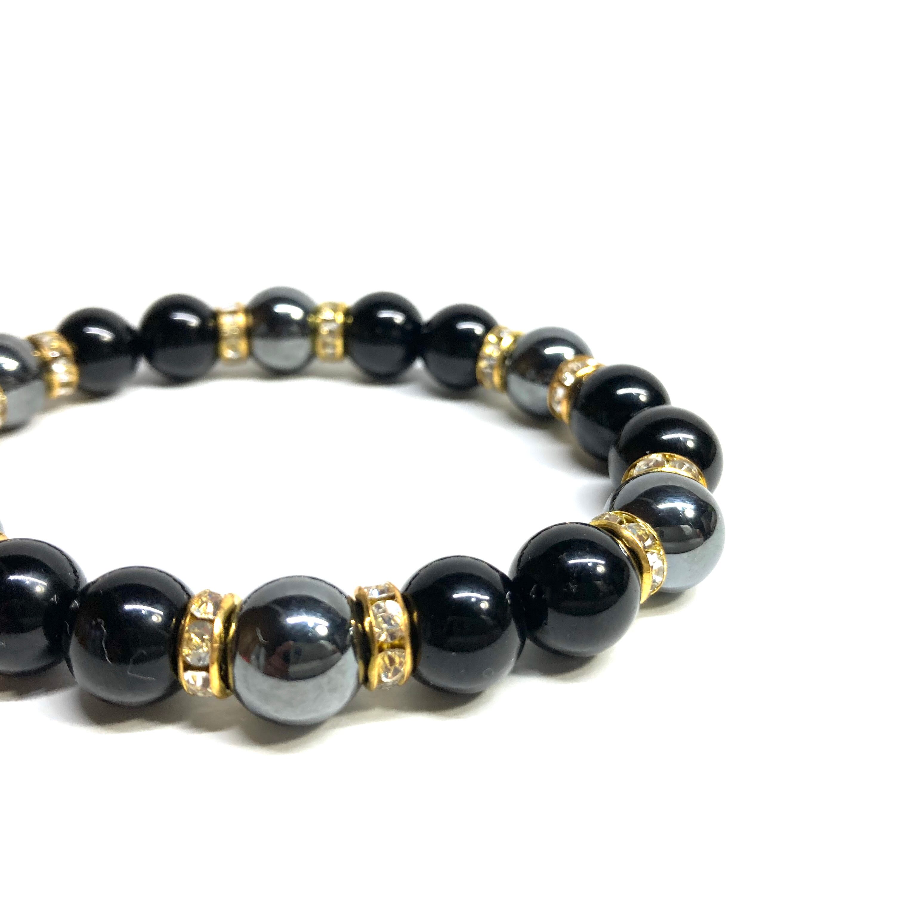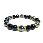 こちらは、モリオンとヘマタイトを組み合わせたパワーストーンブレスレットです。間にはロンデルを挟み高級感あるデザインに仕上げております。石大きさは腕にも馴染みやすいように10mm玉で内径約18cm(伸可能)です。 数に限りがございますので気になる方はお早めにどうぞ。