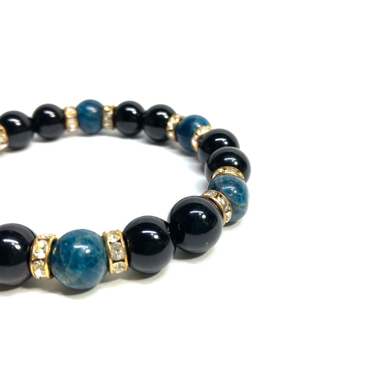 こちらは、モリオンとアパタイトを組み合わせたパワーストーンブレスレットです。間にはロンデルを挟み高級感あるデザインに仕上げております。石大きさは腕にも馴染みやすいように10mm玉で内径約18cm(伸可能)です。 数に限りがございますので気になる方はお早めにどうぞ。