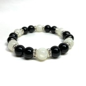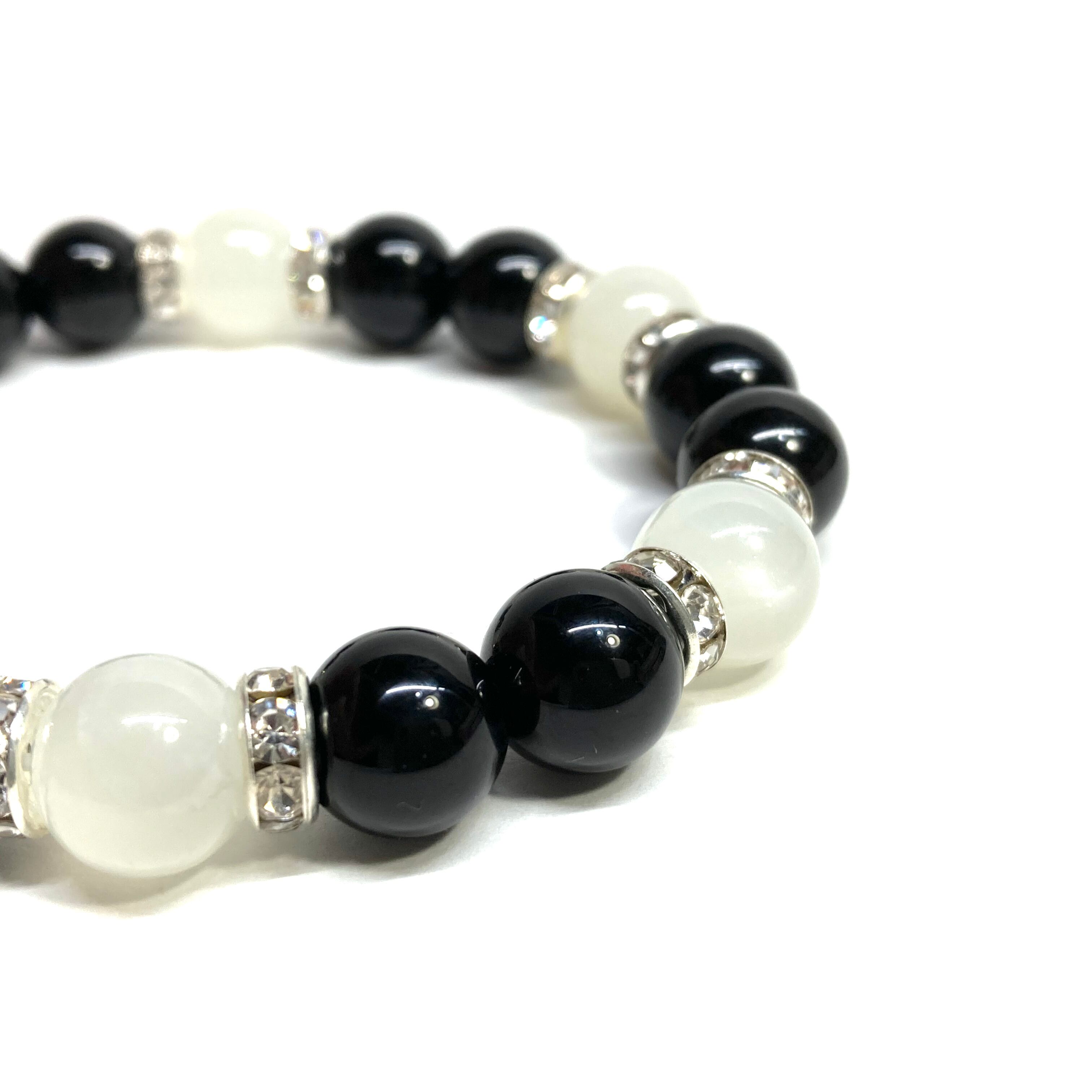 こちらは、モリオンとムーンストーンを組み合わせたパワーストーンブレスレットです。間にはロンデルを挟み高級感あるデザインに仕上げております。石大きさは腕にも馴染みやすいように10mm玉で内径約18cm(伸可能)です。 数に限りがございますので気になる方はお早めにどうぞ。