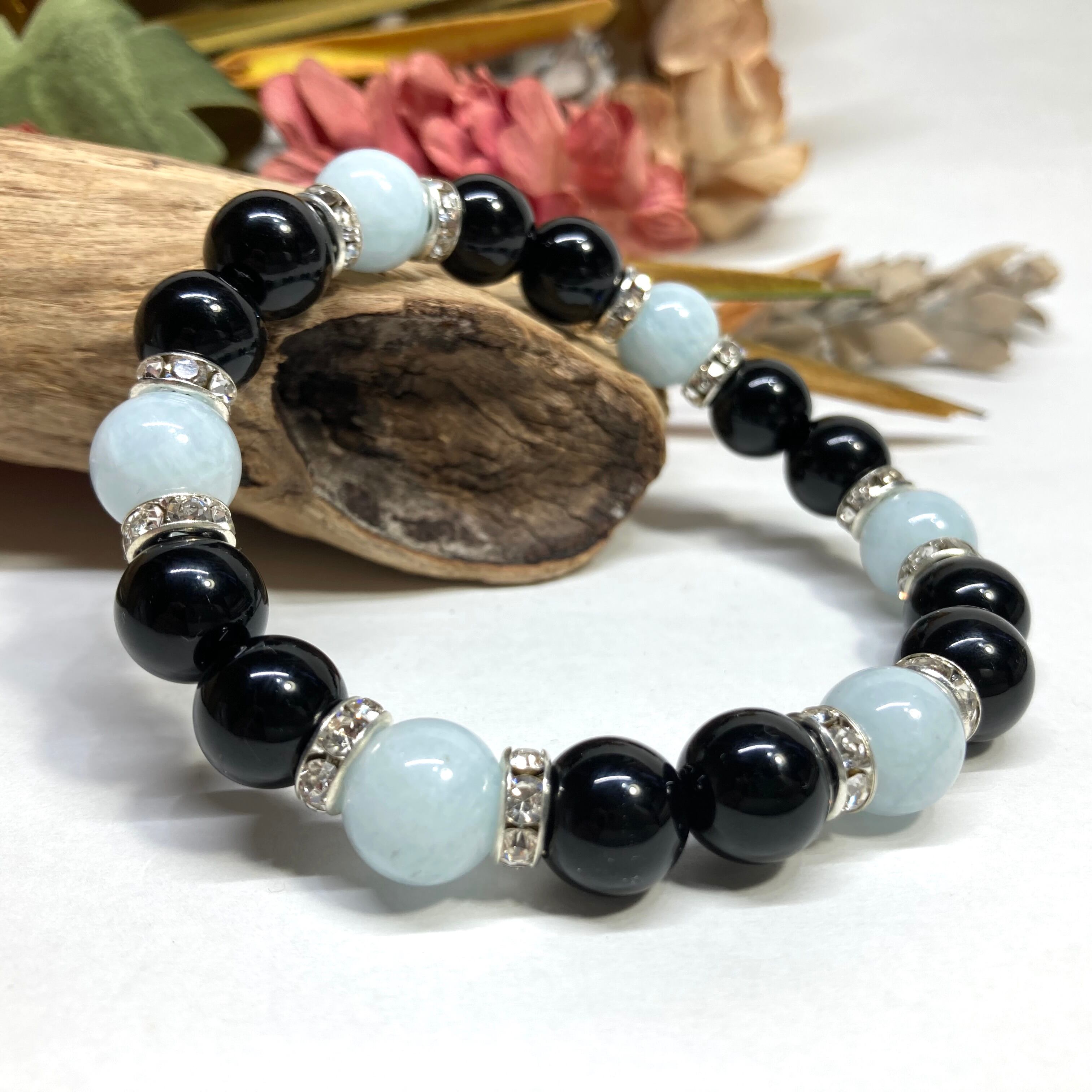 こちらは、モリオンとアクアマリンを組み合わせたパワーストーンブレスレットです。間にはロンデルを挟み高級感あるデザインに仕上げております。石大きさは腕にも馴染みやすいように10mm玉で内径約18cm(伸可能)です。 数に限りがございますので気になる方はお早めにどうぞ。