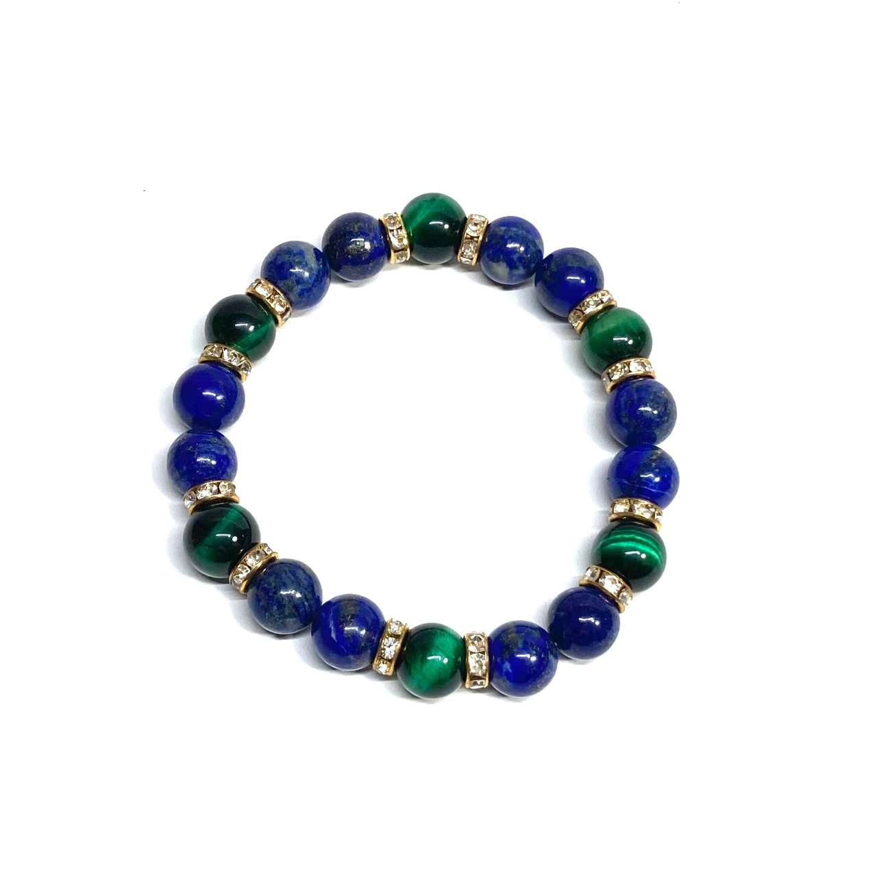 こちらは、ラピスラズリとグリーンタイガーアイを組み合わせたパワーストーンブレスレットです。間にはロンデルを挟み高級感あるデザインに仕上げております。石大きさは腕にも馴染みやすいように10mm玉で内径約18cm(伸可能)です。 数に限りがございますので気になる方はお早めにどうぞ。
