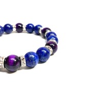 こちらは、ラピスラズリとパープル タイガーアイを組み合わせたパワーストーンブレスレットです。間にはロンデルを挟み高級感あるデザインに仕上げております。石大きさは腕にも馴染みやすいように10mm玉で内径約18cm(伸可能)です。 数に限りがございますので気になる方はお早めにどうぞ。