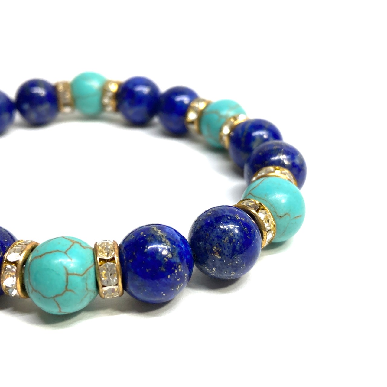 こちらは、ラピスラズリとターコイズを組み合わせたパワーストーンブレスレットです。間にはロンデルを挟み高級感あるデザインに仕上げております。石大きさは腕にも馴染みやすいように10mm玉で内径約18cm(伸可能)です。 数に限りがございますので気になる方はお早めにどうぞ。