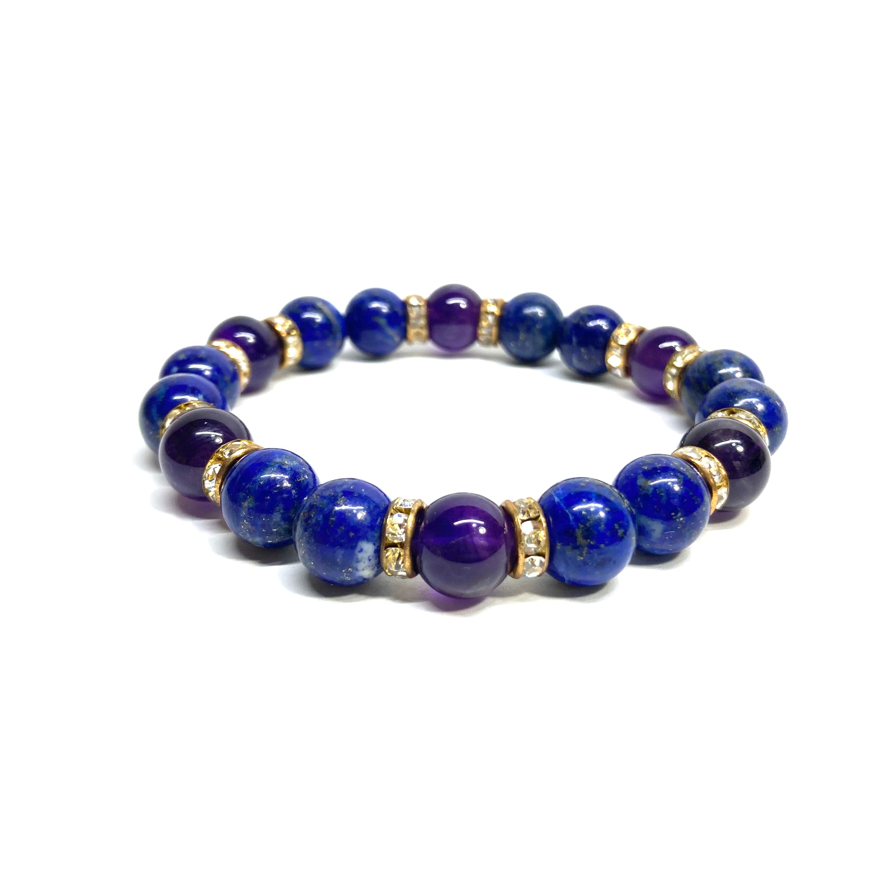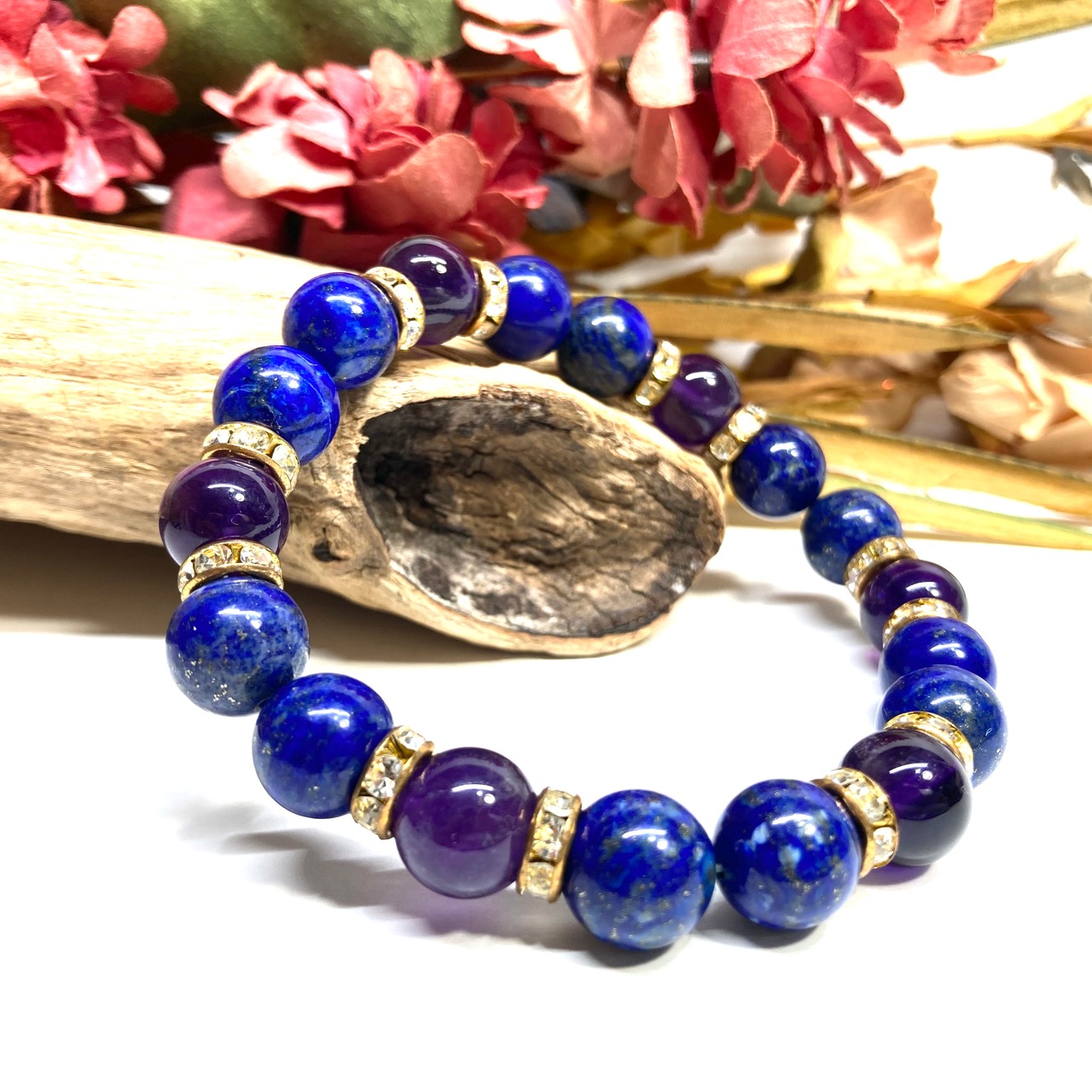 こちらは、ラピスラズリとアメジストを組み合わせたパワーストーンブレスレットです。間にはロンデルを挟み高級感あるデザインに仕上げております。石大きさは腕にも馴染みやすいように10mm玉で内径約18cm(伸可能)です。 数に限りがございますので気になる方はお早めにどうぞ。