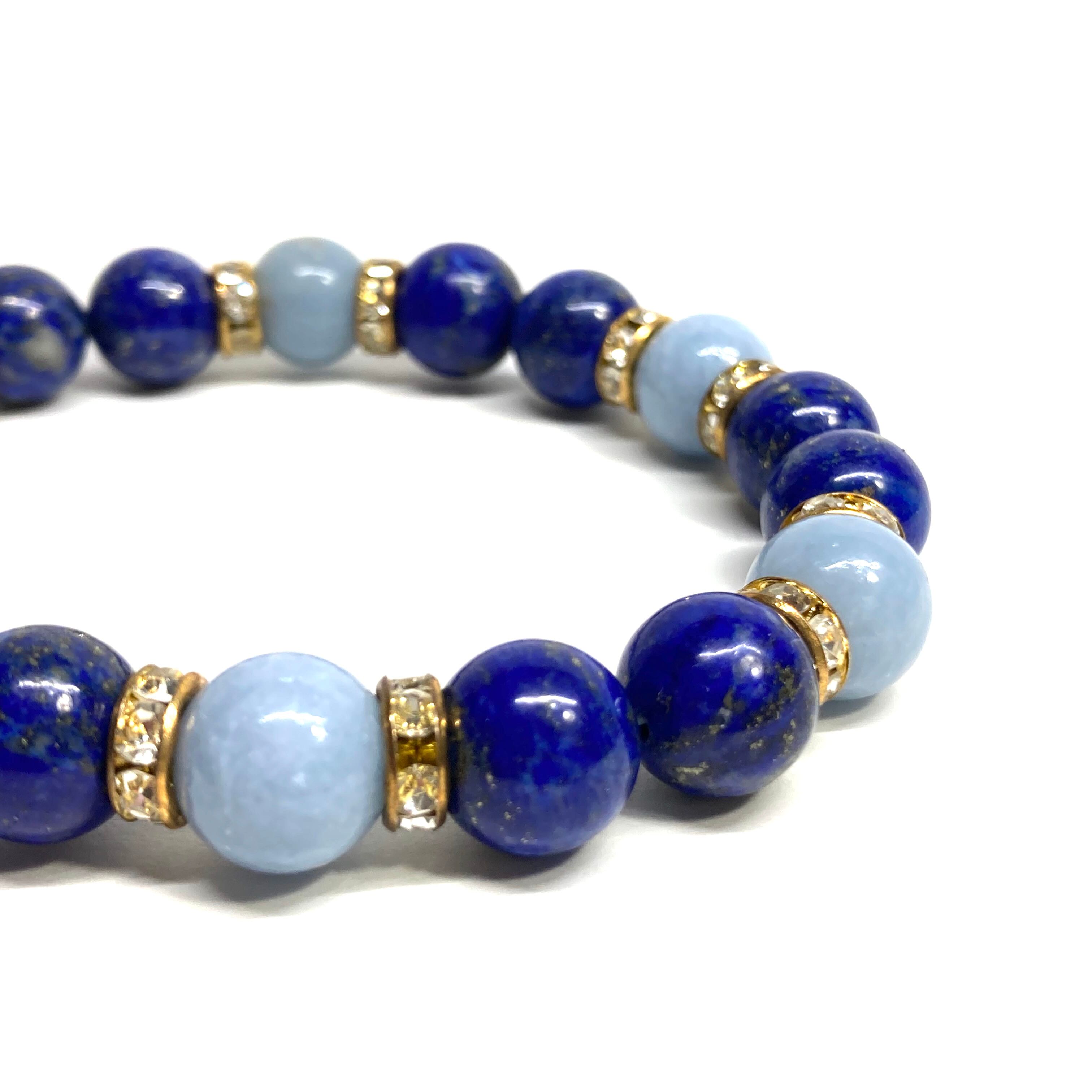 こちらは、ラピスラズリとエンジェライトを組み合わせたパワーストーンブレスレットです。間にはロンデルを挟み高級感あるデザインに仕上げております。石大きさは腕にも馴染みやすいように10mm玉で内径約18cm(伸可能)です。 数に限りがございますので気になる方はお早めにどうぞ。