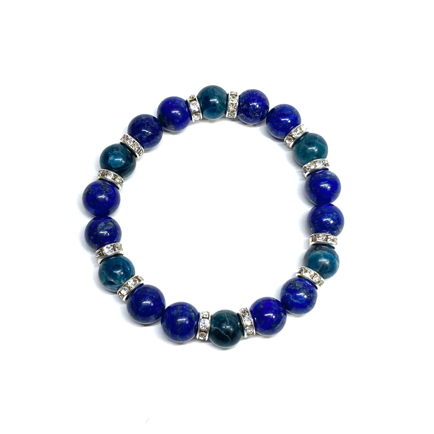 こちらは、ラピスラズリとアパタイトを組み合わせたパワーストーンブレスレットです。間にはロンデルを挟み高級感あるデザインに仕上げております。石大きさは腕にも馴染みやすいように10mm玉で内径約18cm(伸可能)です。 数に限りがございますので気になる方はお早めにどうぞ。