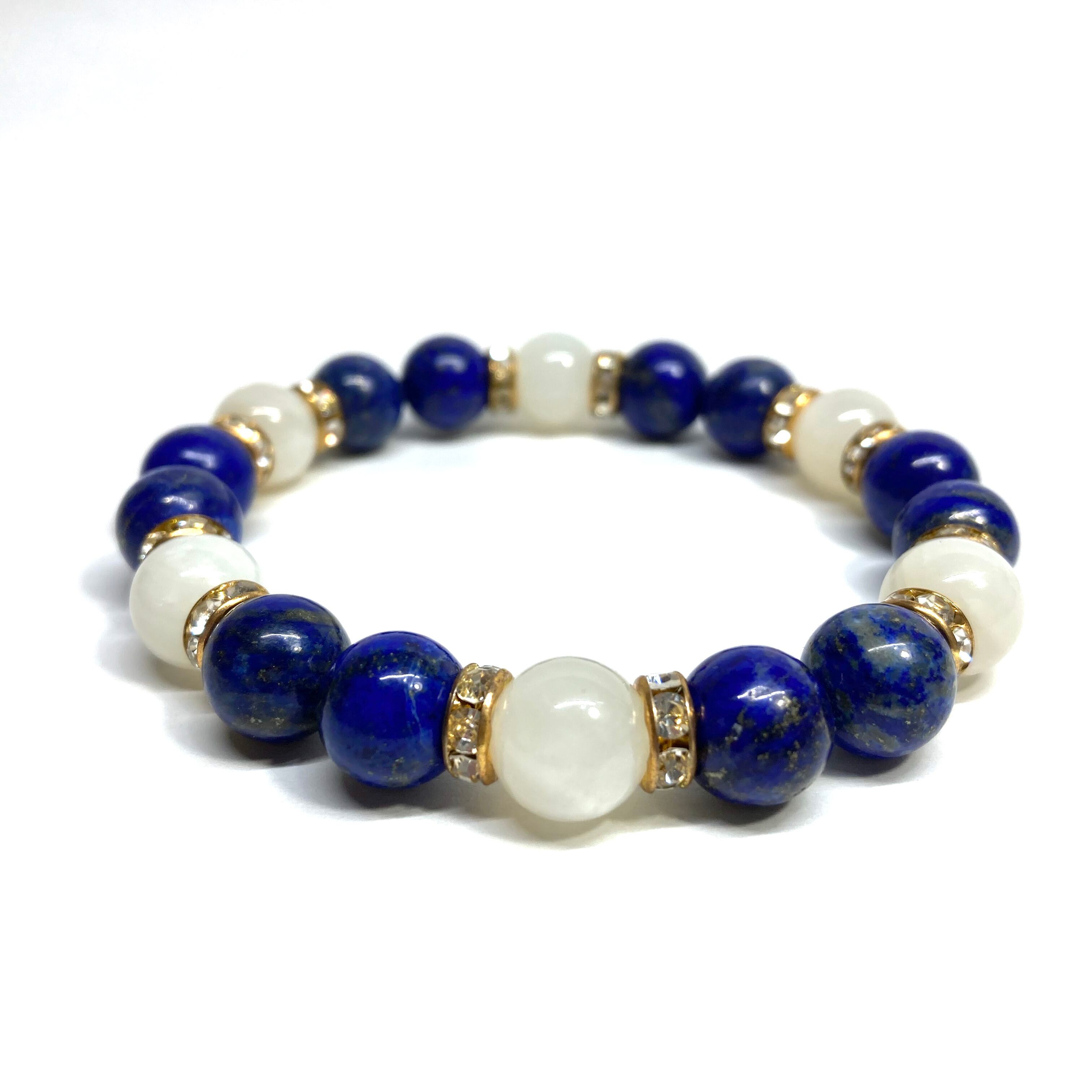こちらは、ラピスラズリとムーンストーンを組み合わせたパワーストーンブレスレットです。間にはロンデルを挟み高級感あるデザインに仕上げております。石大きさは腕にも馴染みやすいように10mm玉で内径約18cm(伸可能)です。 数に限りがございますので気になる方はお早めにどうぞ。