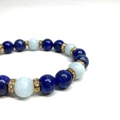 こちらは、ラピスラズリとアクアマリンを組み合わせたパワーストーンブレスレットです。間にはロンデルを挟み高級感あるデザインに仕上げております。石大きさは腕にも馴染みやすいように10mm玉で内径約18cm(伸可能)です。 数に限りがございますので気になる方はお早めにどうぞ。