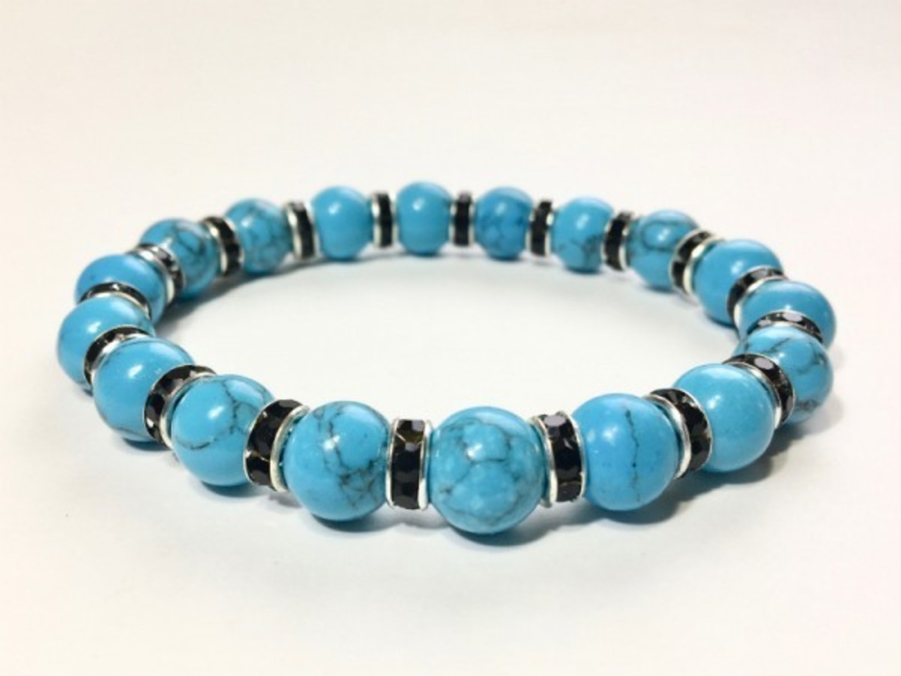 こちらは、10mm玉のターコイズを使用したブレスレットです。間にはロンデルが挟まれ高級感あるデザインに仕上がったブレスレット。シンプルなデザインですのでどんなコーディネートとも合わせ易いブレスレットです。石大きさは腕にも馴染みやすいように10mm玉で内周約18cmです。(オペロンゴムのため伸縮性があります) 数に限りがございますので気になる方はお早めにどうぞ。