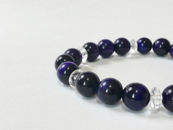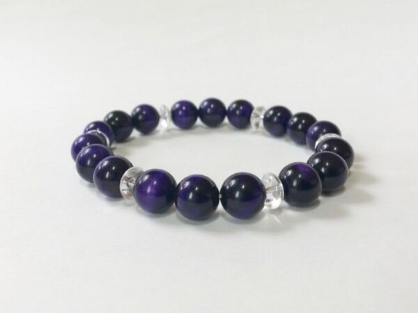 こちらは、10mm玉のパープルタイガーアイを使用したブレスレットです。石との間に挟まれた水晶のソロバンがアクセントになったデザインです。シンプルなデザインは使い勝手がよく、どんなコーディネートにも合わせやすいブレスレットです。石大きさは腕にも馴染みやすいように10mm玉で内周約16.5cmです。(オペロンゴムのため伸縮性があります) 数に限りがございますので気になる方はお早めにどうぞ。