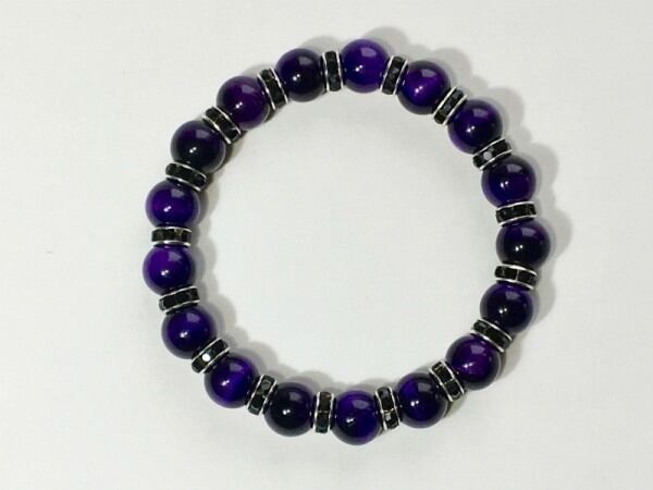こちらは、10mm玉のパープルタイガーアイを使用したブレスレットです。間にはロンデルが挟まれ高級感あるデザインに仕上がったブレスレット。シンプルなデザインですのでどんなコーディネートとも合わせ易いブレスレットです。石大きさは腕にも馴染みやすいように10mm玉で内周約18cmです。(オペロンゴムのため伸縮性があります) 数に限りがございますので気になる方はお早めにどうぞ。