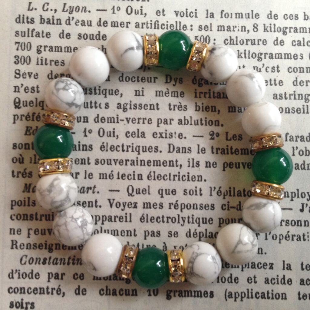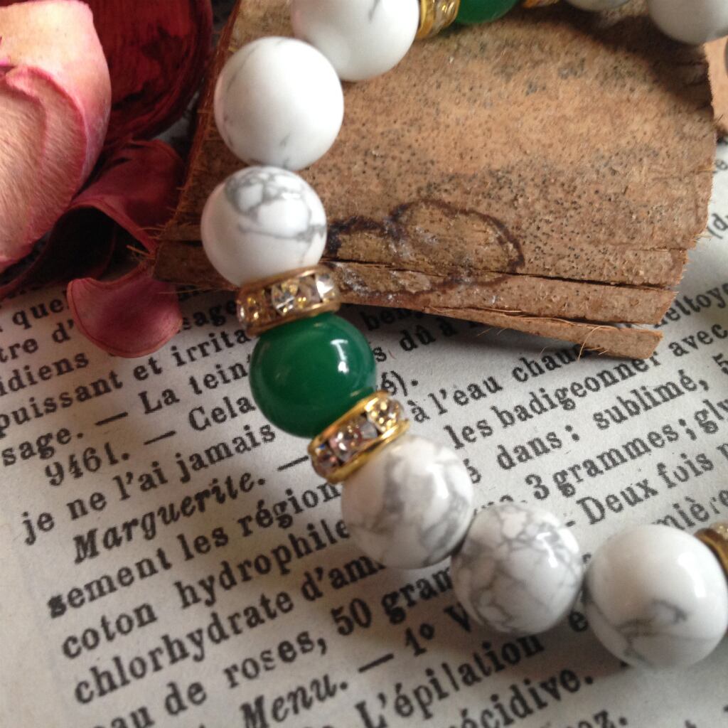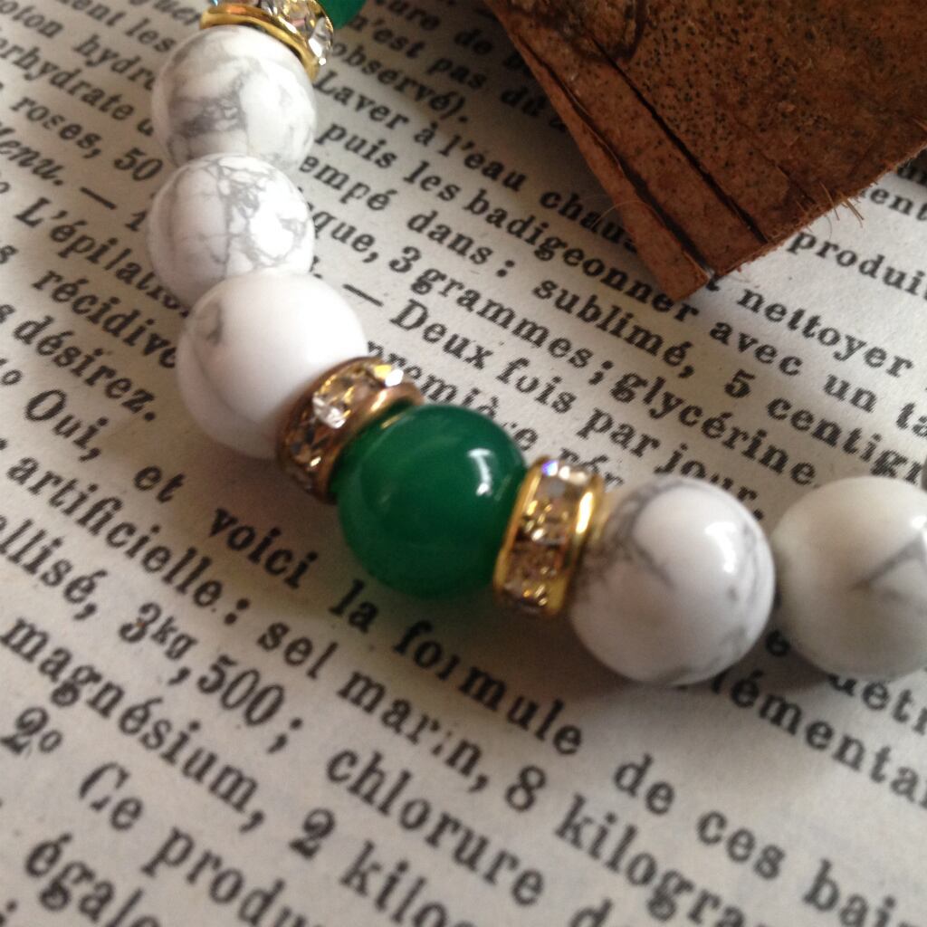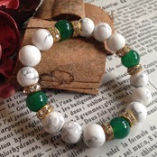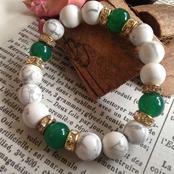 こちらは、10mm玉のグリーンメノウとハウライトを使用した天然石ブレスレットです。間にゴールドのロンデルを挟み高級感のあるデザインに仕上がっています。石大きさは腕にも馴染みやすいように10mm玉で内周約16cm(ゴムなので伸可能)です。気になる方は是非この機会にどうぞ。