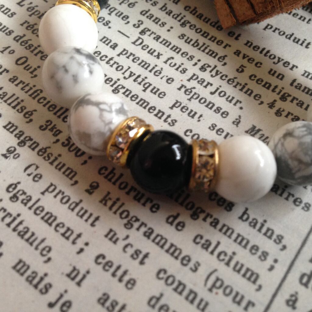 こちらは、10mm玉のオニキスとハウライトを使用した天然石ブレスレットです。間にゴールドのロンデルを挟み高級感のあるデザインに仕上がっています。石大きさは腕にも馴染みやすいように10mm玉で内周約16cm(ゴムなので伸可能)です。気になる方は是非この機会にどうぞ。