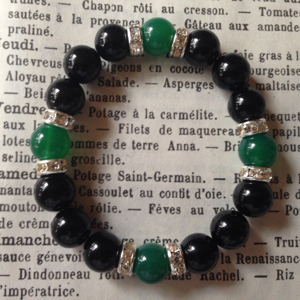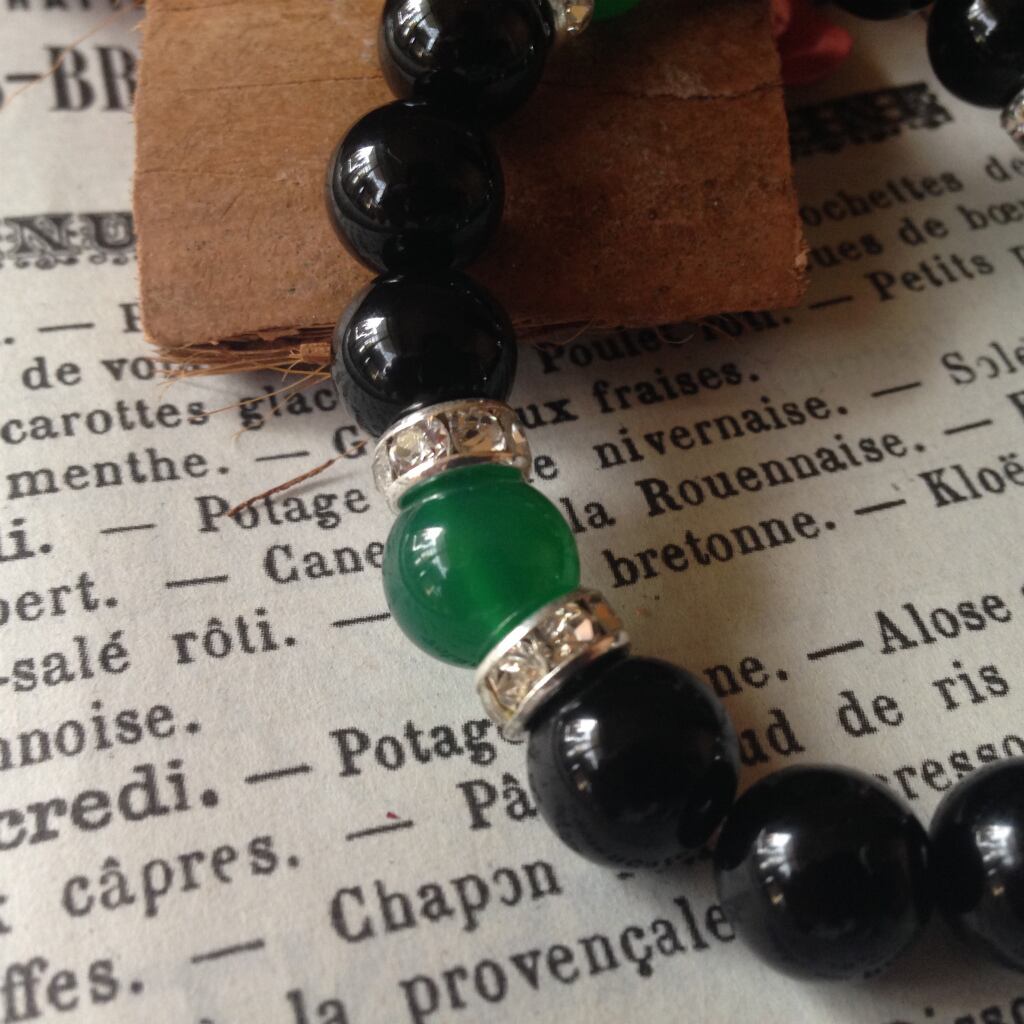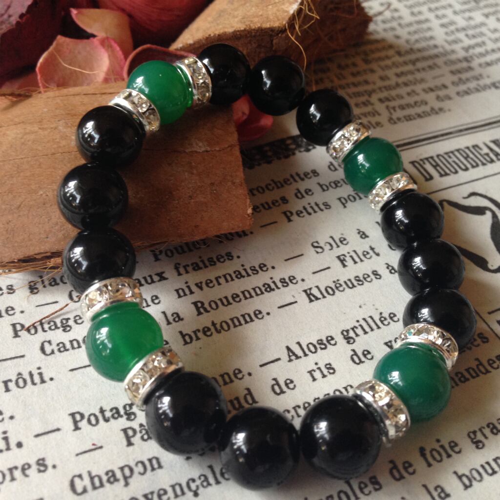 こちらは、10mm玉の緑メノウとオニキスを使用した天然石ブレスレットです。間にシルバーのロンデルを挟み高級感のあるデザインに仕上がっています。石大きさは腕にも馴染みやすいように10mm玉で内周約16cm(ゴムなので伸可能)です。気になる方は是非この機会にどうぞ。