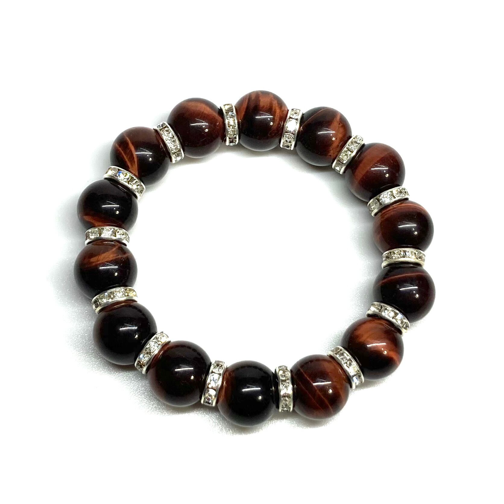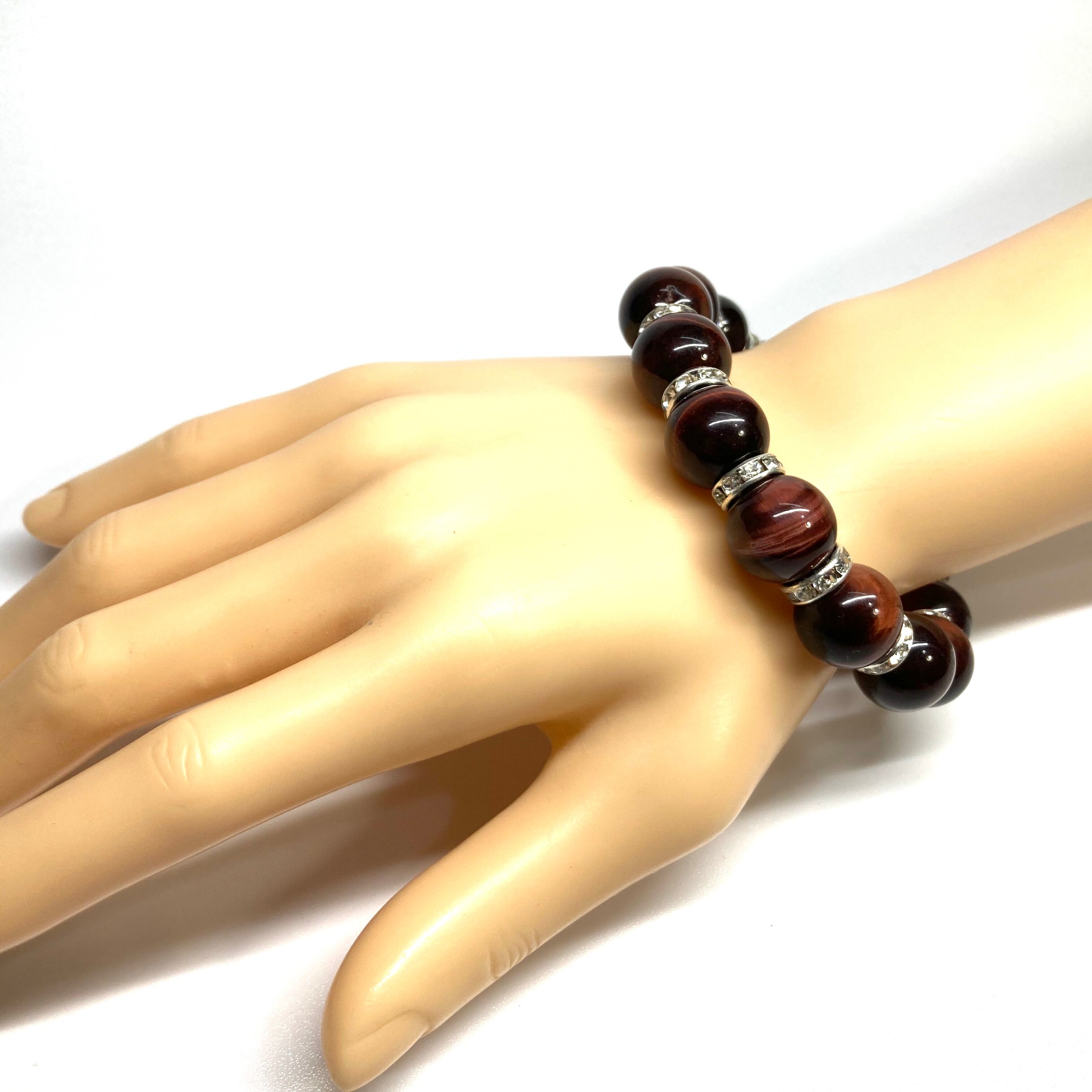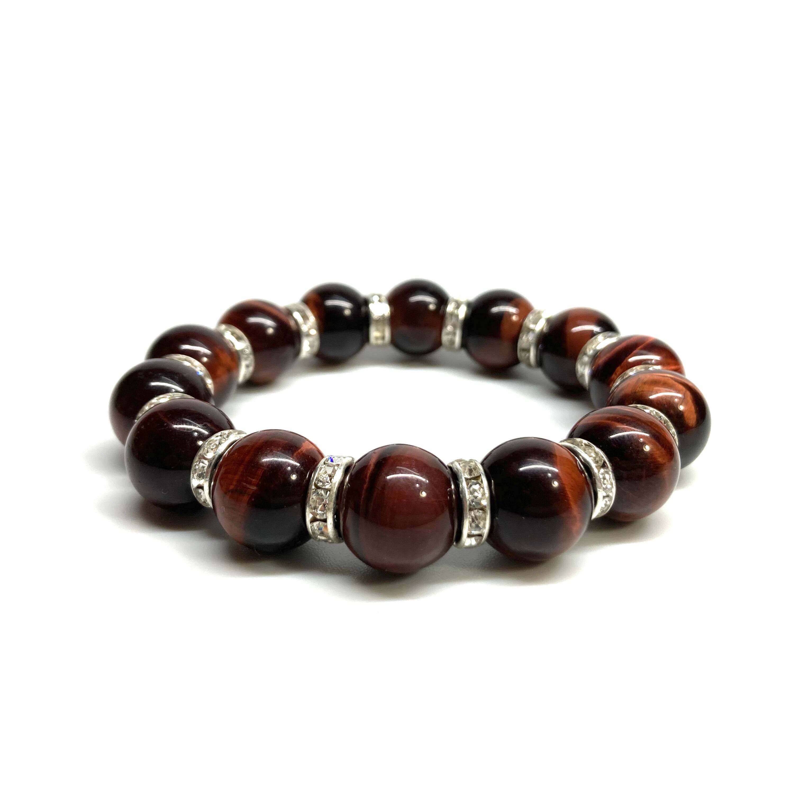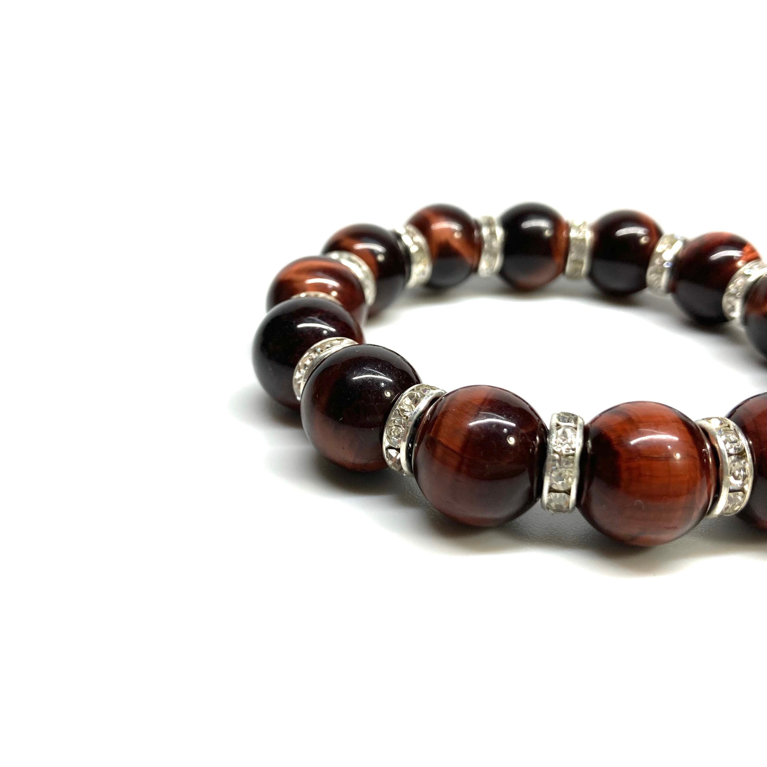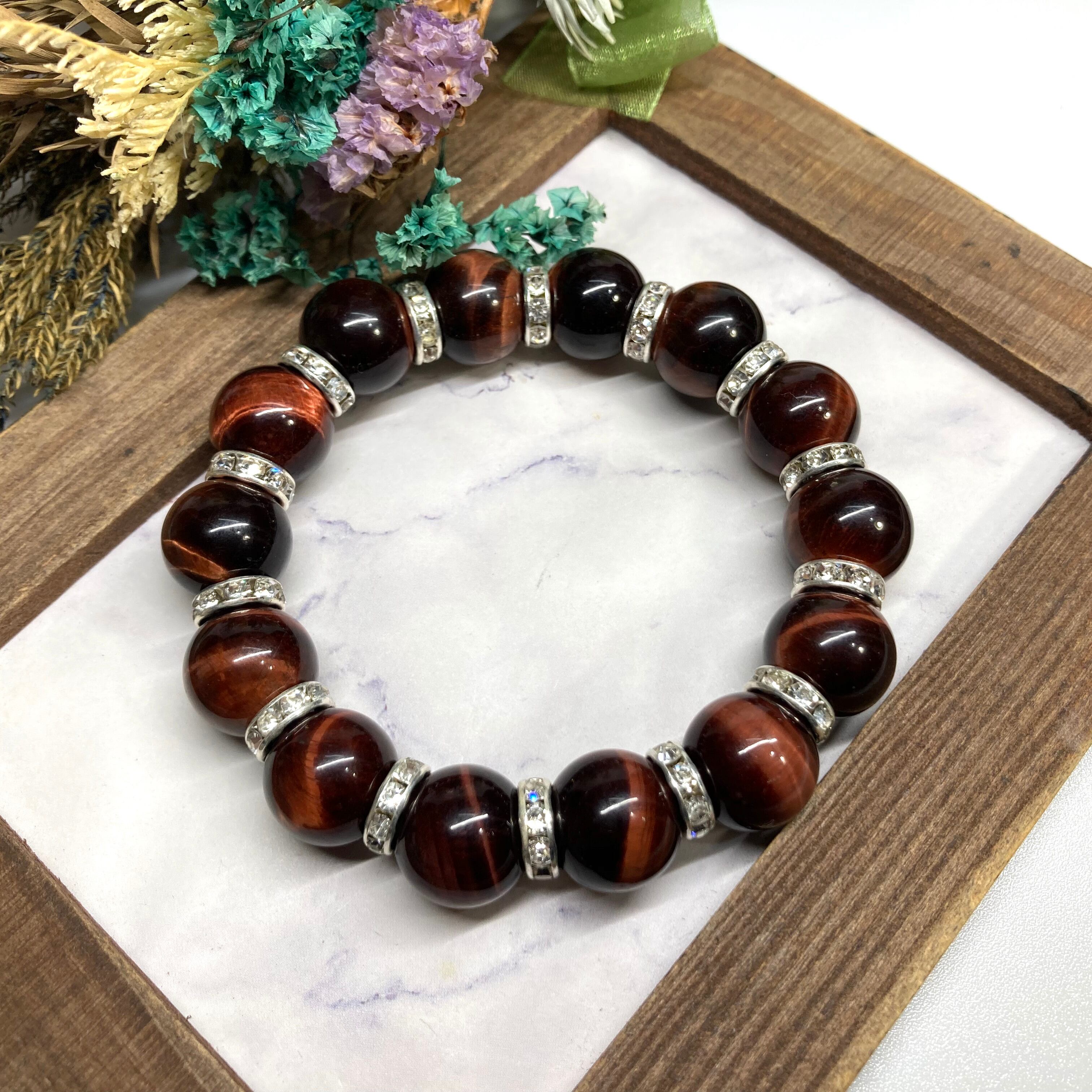こちらは、14mm玉のレッドタイガーアイを使用した天然石ブレスレットです。シンプルなデザインですのでどんなコーディネートとも合わせ易いブレスレットです。石との間にはロンデルを挟み高級感を演出しています。石大きさはインパクトを与えてくれる大きさの14mm玉を使用しています。内周約17cmです。数に限りがございますので気になる方はお早めにどうぞ。