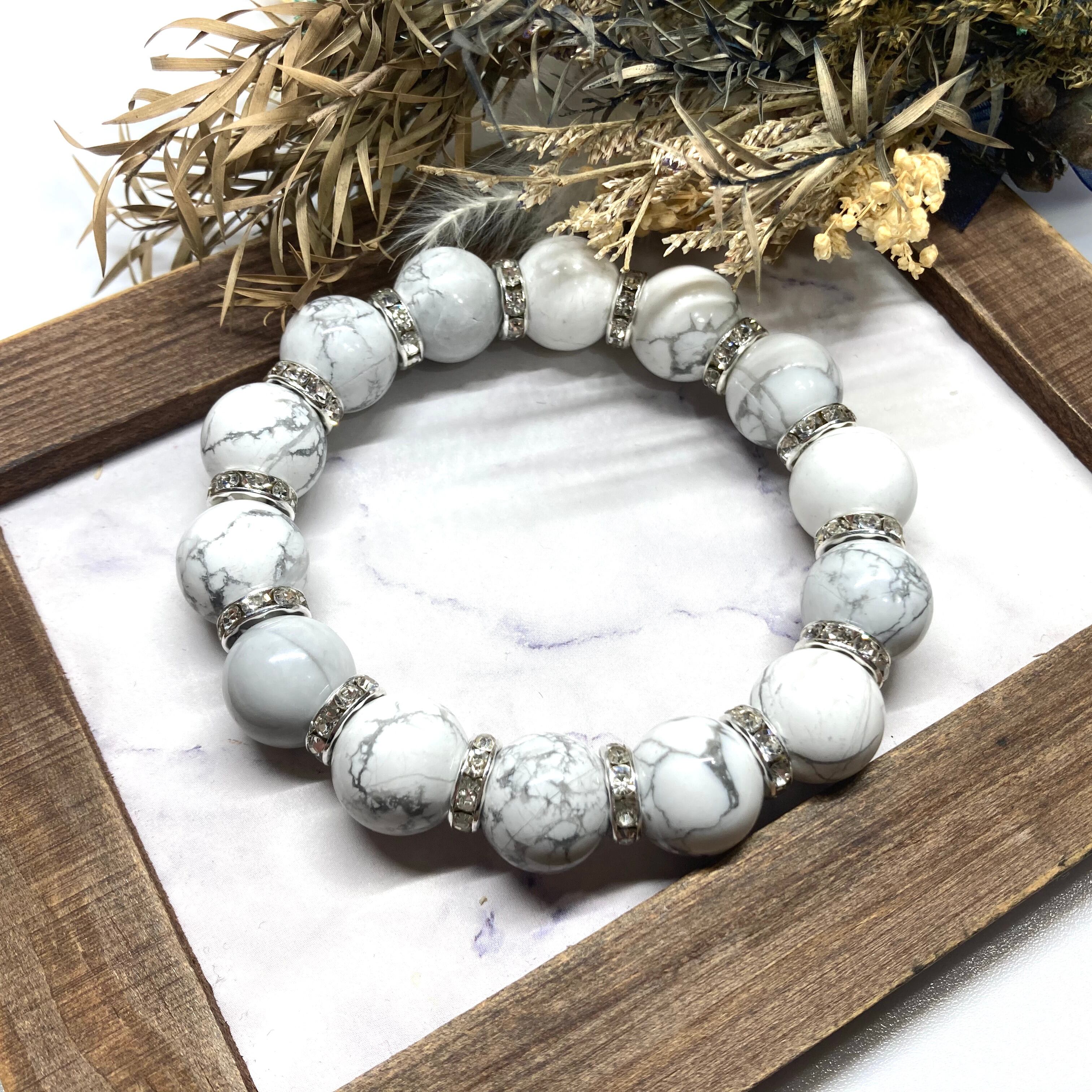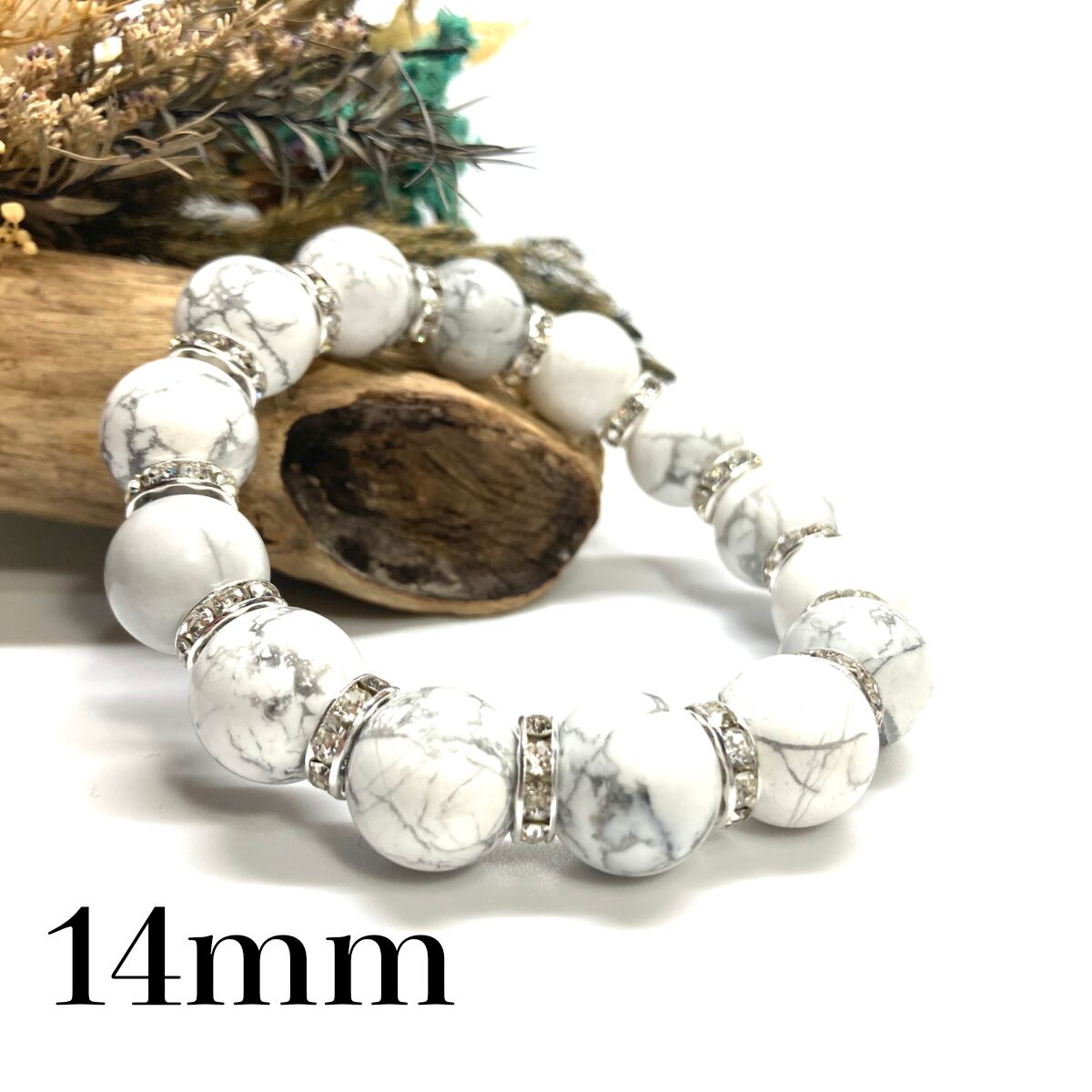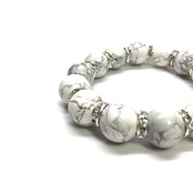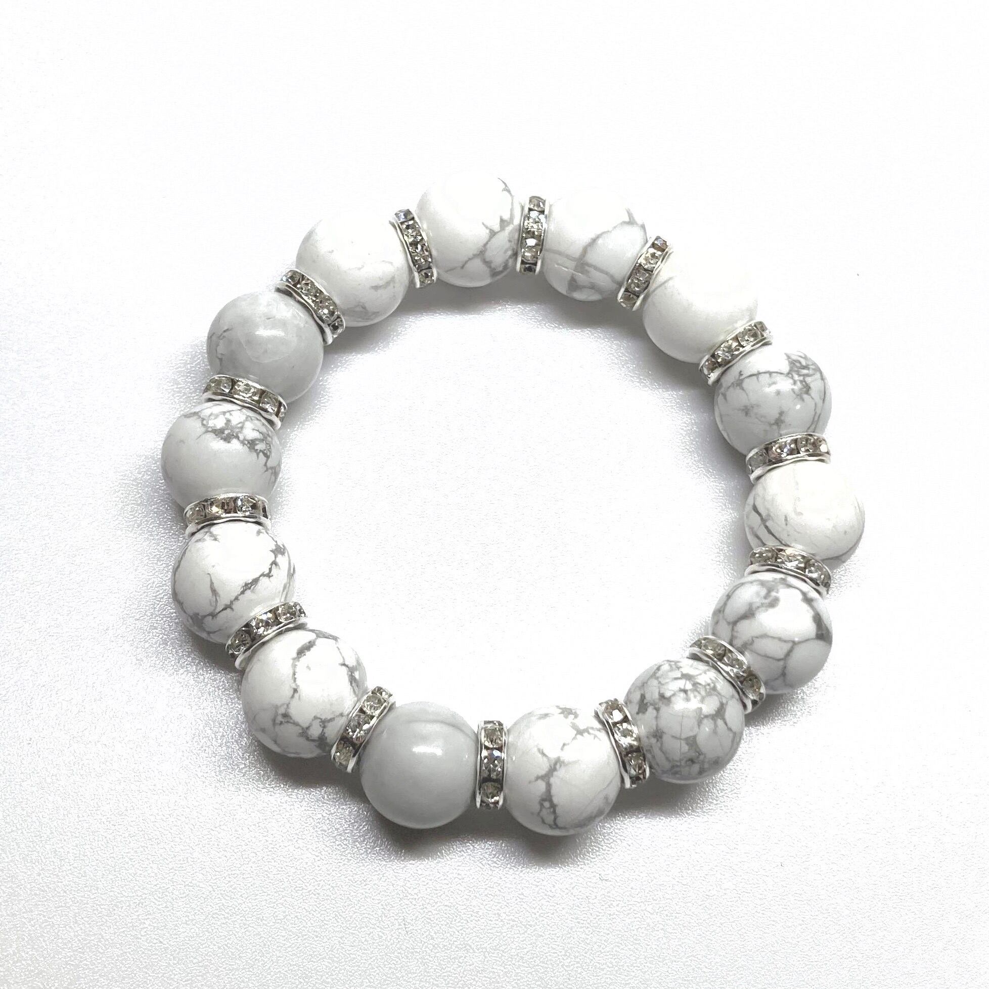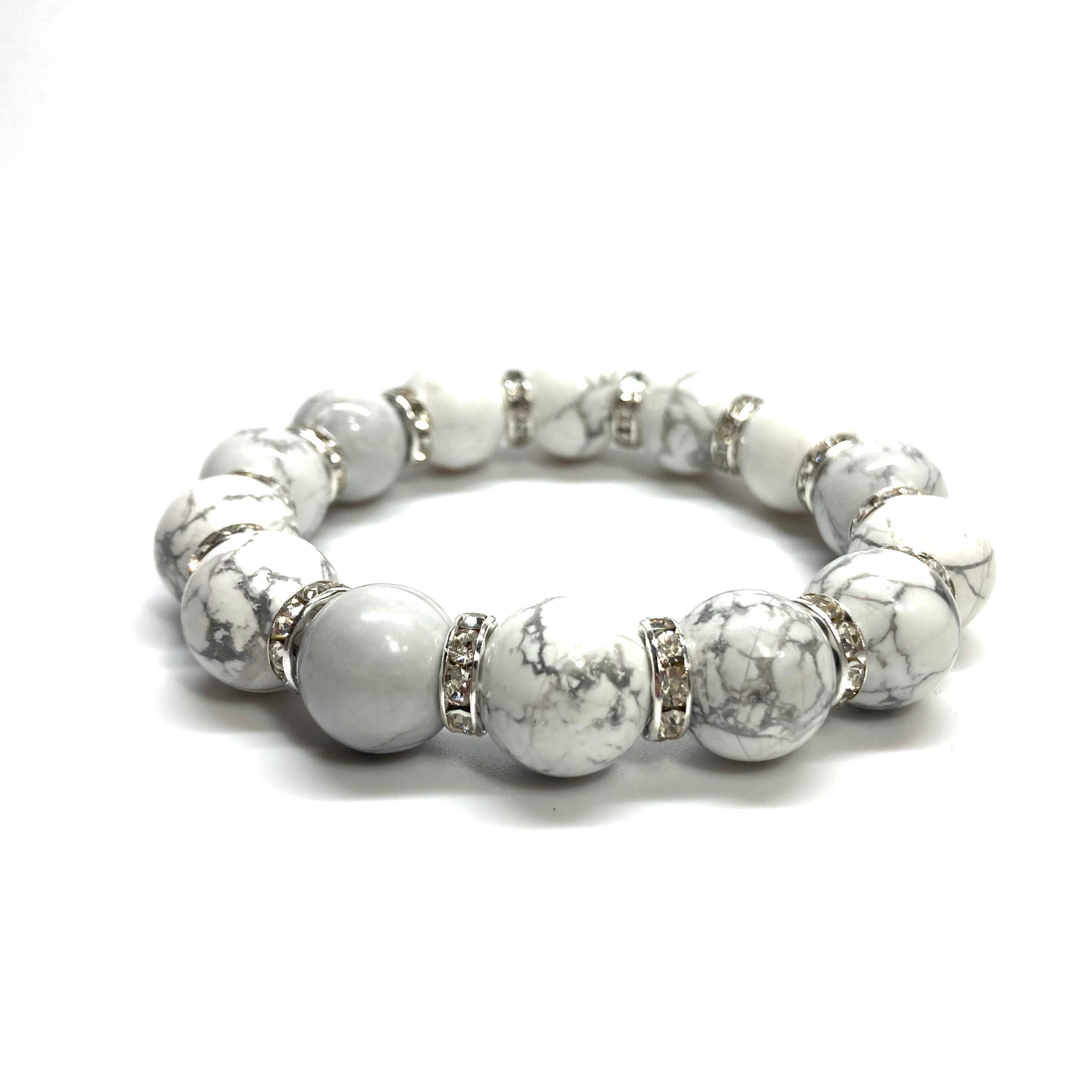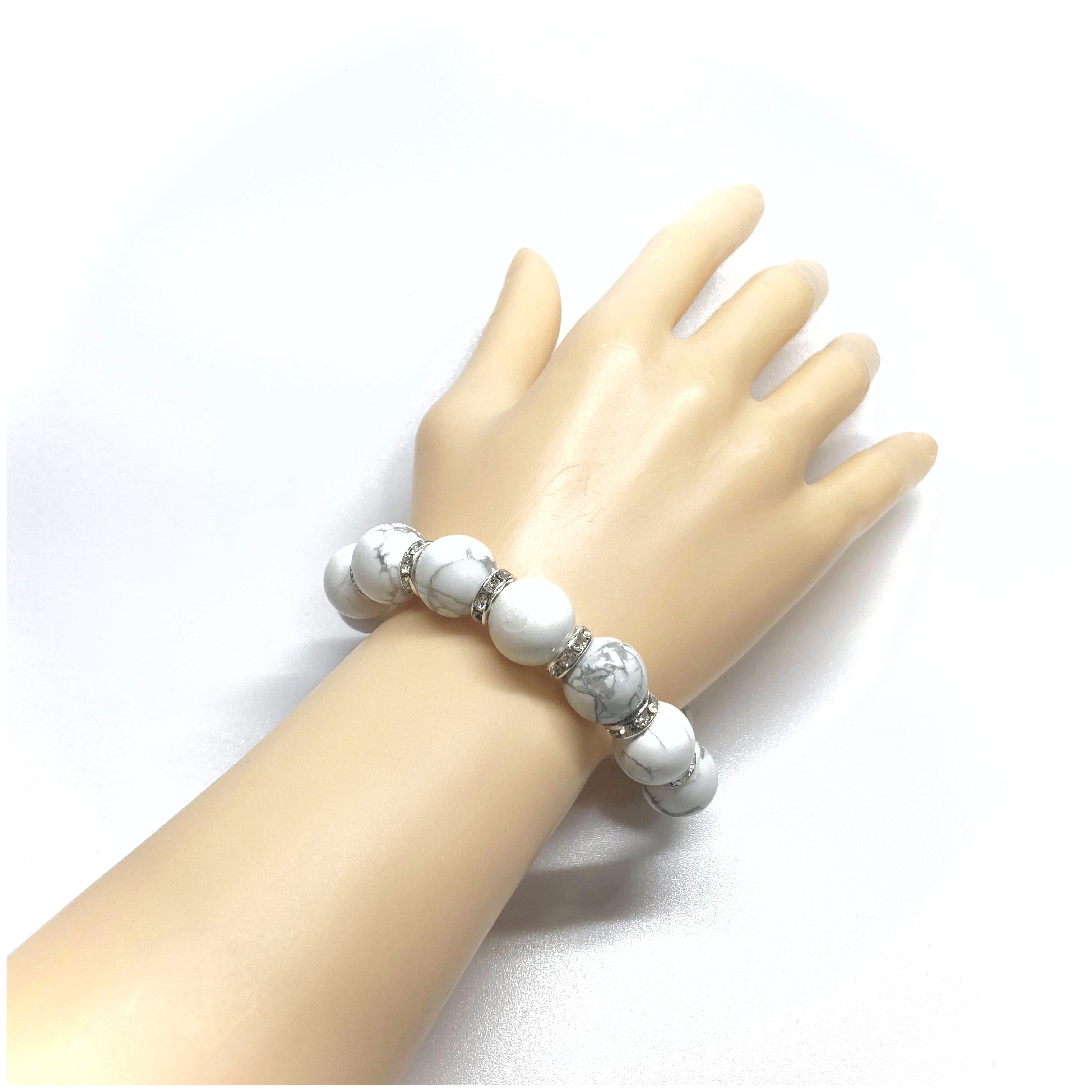 こちらは、14mm玉のハウライトを使用した天然石ブレスレットです。シンプルなデザインですのでどんなコーディネートとも合わせ易いブレスレットです。石との間にはロンデルを挟み高級感を演出しています。石大きさはインパクトを与えてくれる大きさの14mm玉を使用しています。内周約17cmです。数に限りがございますので気になる方はお早めにどうぞ。